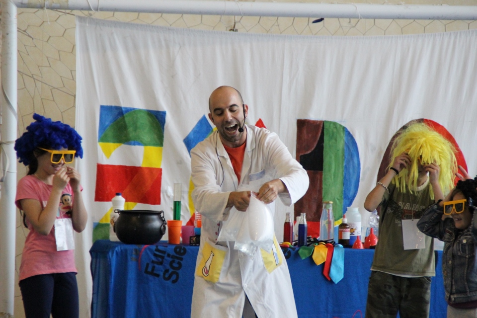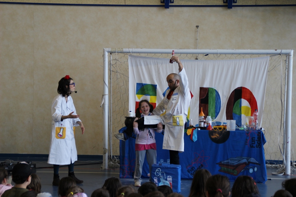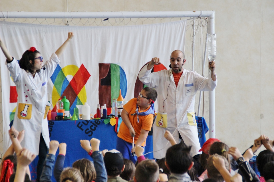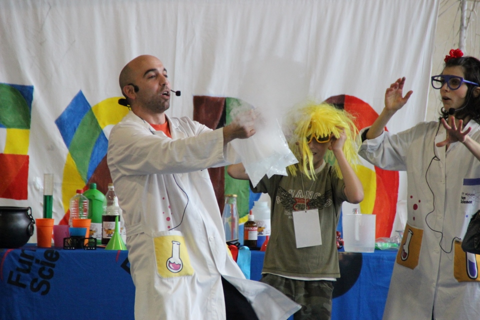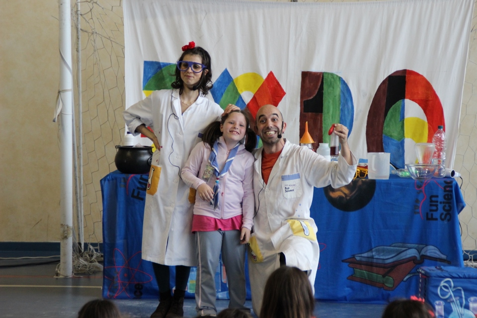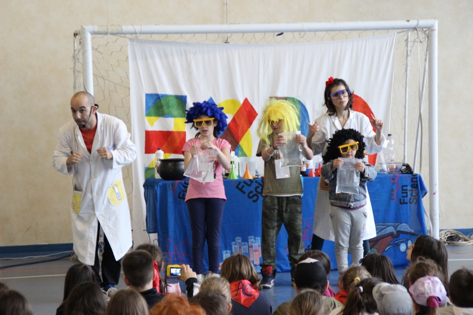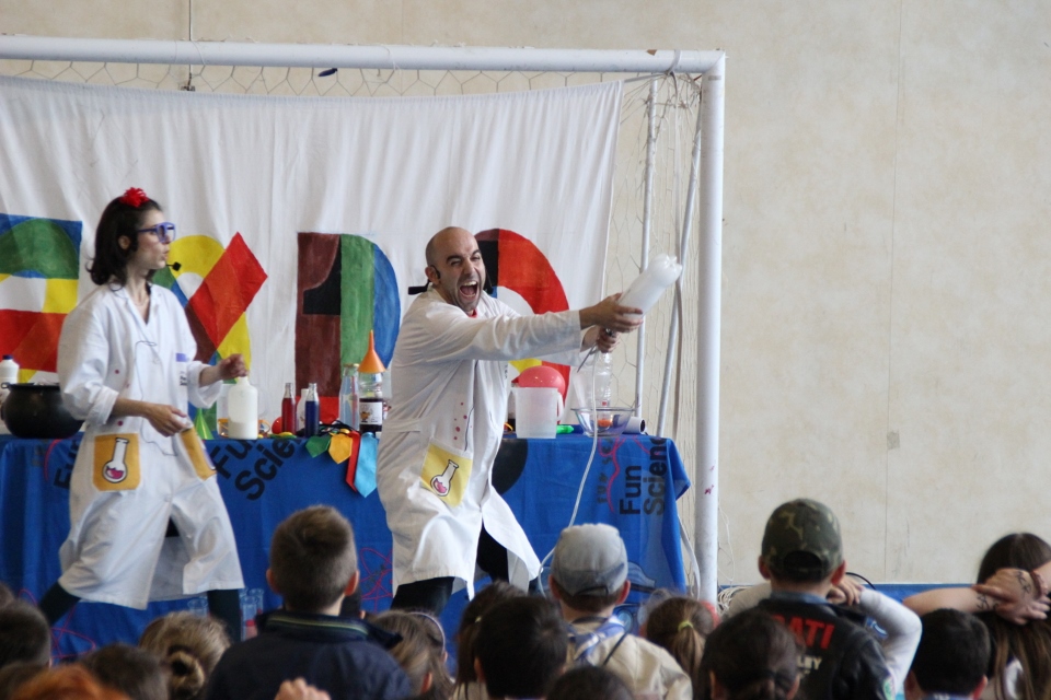 Mentre l’EXPO era aperto, nella palestra vicina è iniziato lo spettacolo dei FUN SCIENCE, un’associazione culturale dell’Emilia Romagna che si propone di insegnare, attraverso un metodo innovativo e divertente, i principi della scienza; i bravissimi FUN SCIENCE hanno proposto una serie esperimenti in maniera divertente, coinvolgendo i bambini in prima persona: in molti hanno fatto a gara per fare i piccoli scienziati volontari!