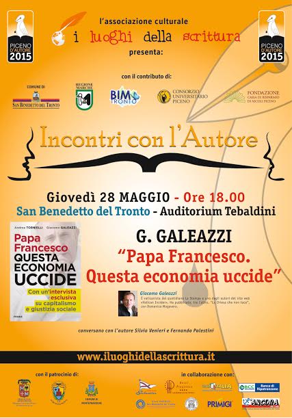 SAN BENEDETTO DEL TRONTO – Nell’ambito della rassegna “Piceno d’Autore 2015”, organizzata dal Comune di San Benedetto del Tronto e dall’Associazione culturale “I Luoghi della Scrittura”, con l’adesione dell’Ufficio Cultura della Diocesi di San Benedetto Tr.-Ripatransone e Montalto e del Club Unesco San Benedetto Tr., oggi, giovedì 28 maggio, alle ore 18:00, presso l’auditorium “Tebaldini” di San Benedetto, si svolgerà l’incontro con l’autore Giacomo Galeazzi con l’opera “Papa Francesco. Questa economia uccide”.