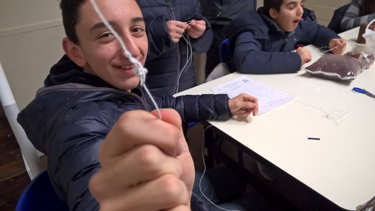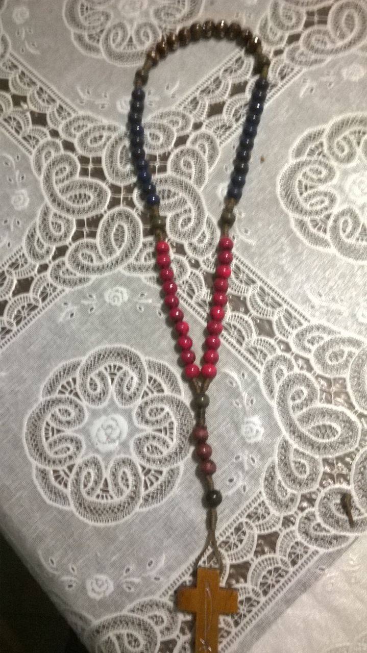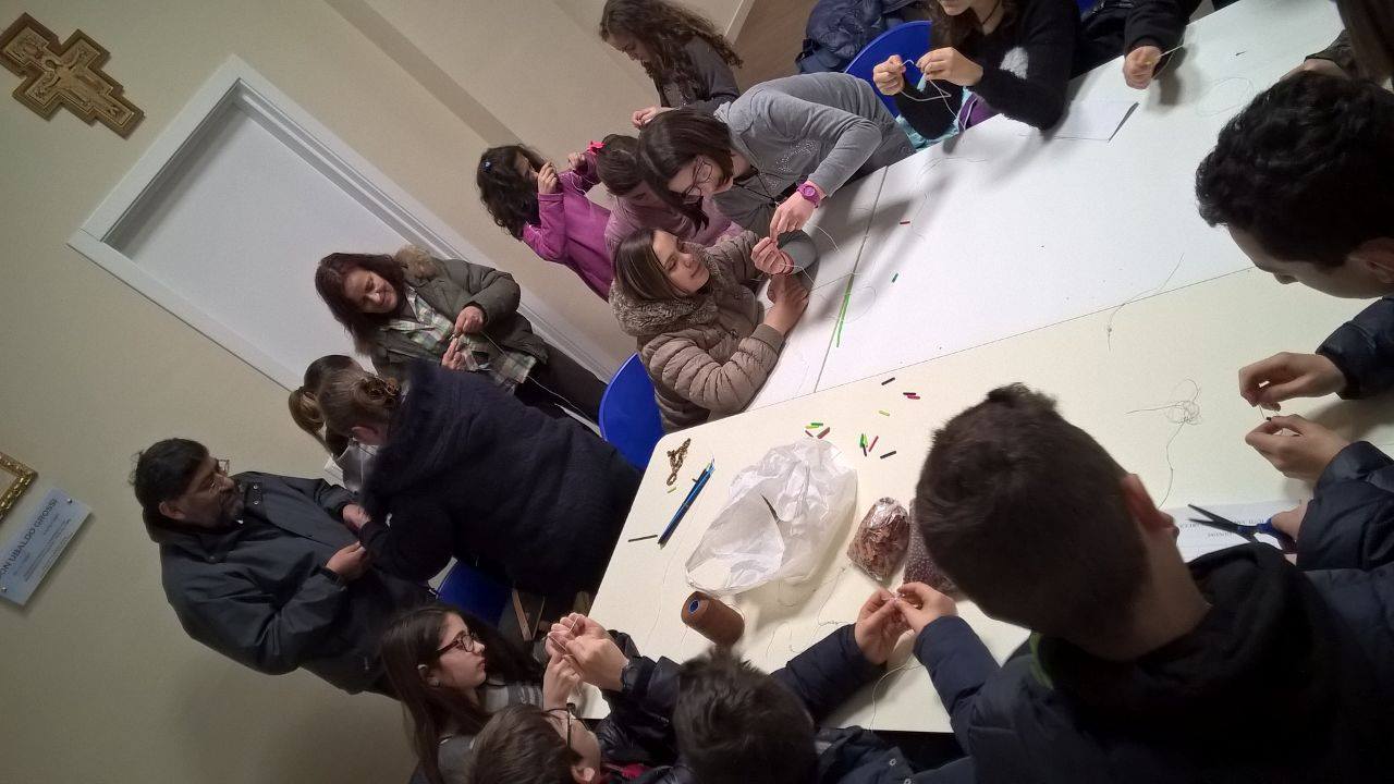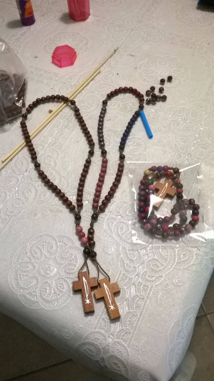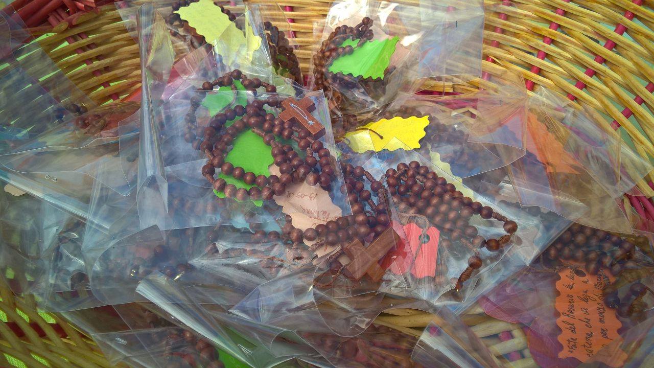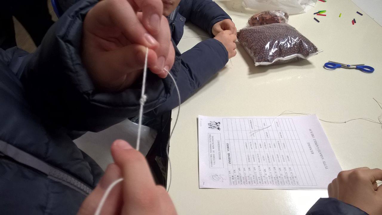 Presto detto. È cominciato tutto per caso, con un tutorial trovato su Youtube, poi con il grande aiuto di Giansenia (nonna di uno dei nostri ragazzi) che ha collaudato il primo modello di rosario per poter mostrare i vari procedimenti della realizzazione e, infine, non da poco è stata anche la grande collaborazione dei genitori per ultimare i lavori prima e addirittura durante i giorni della Festa!