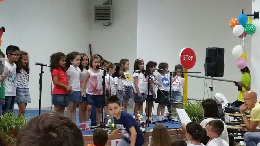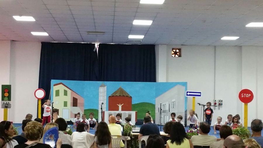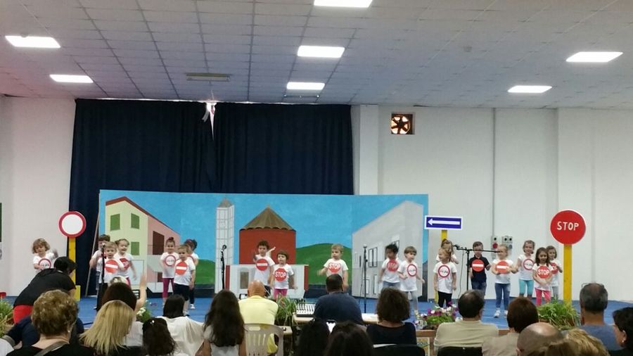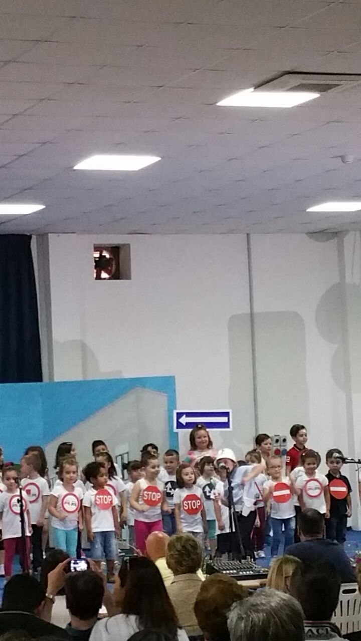 A fare da cornice un allestimento doc: un palco coloratissimo e dalla scenografia raffigurante un’immaginaria piazza, quella del paese, con la chiesa del Sacro Cuore dipinta sullo sfondo e alla sua sinistra il palazzo municipale, circondato da palloncini e da tanti segnali come quelli che si trovano per le strade. Il tema didattico della recita di quest’anno, infatti, è stato quello dell’educazione alla sicurezza stradale e ha coinvolto tutti i bambini dell’Istituto, a partire da quelli più piccoli, dell’età di tre anni, fino a quelli più grandi di cinque, che dopo l’estate inizieranno invece a frequentare la scuola elementare.