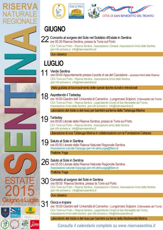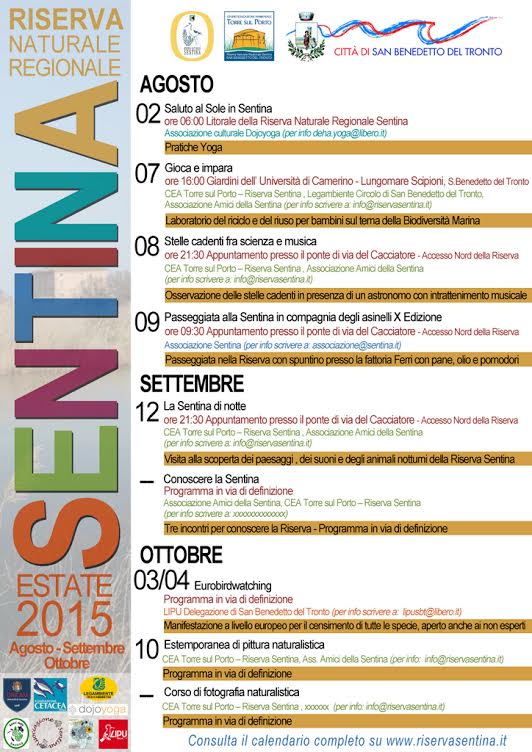Dopo il notevole successo degli eventi organizzati nello scorso anno in occasione del decennale della istituzione della Riserva Naturale Sentina, per le stagioni estiva ed autunnale 2015 si è deciso di organizzare, per la Riserva Sentina, un calendario ancor più ricco ed interessante.