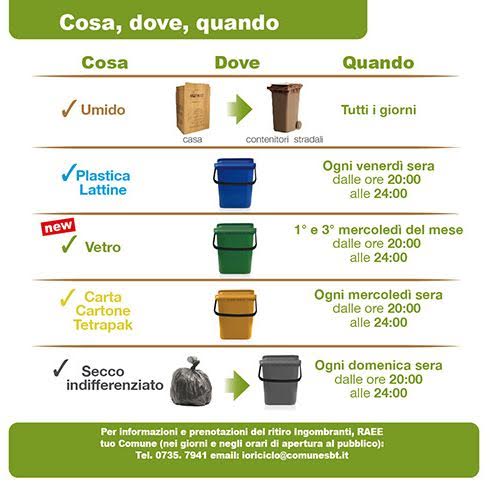 Ad ogni famiglia (per ora, come detto, il servizio partirà in modo sperimentale al Paese Alto e al Ponterotto) verrà consegnato un kit per la raccolta differenziata composto da un mastello grigio per i rifiuti che non si possono differenziare (quelli cioè che devono andare in discarica), uno giallo per carta e tetrapak, uno azzurro per plastica e lattine, uno verde per il vetro: chi non ha più il cestello sottolavello marrone areato per la raccolta dell’umido lo potrà richiedere.