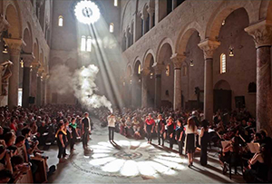 L’estate a Bari non arriva solo con i primi caldi, i primi bagni in mare e i primi gelati. A Bari l’annuncio dell’estate arriva sotto forma di una rosa luminosa. Quella che da mille anni, il 21 giugno, illumina l’interno della cattedrale di san Sabino nella città vecchia. Alle 17.08 in punto, nel giorno del solstizio d’estate, i raggi del sole attraversano il grande rosone che si trova sulla facciata della cattedrale, raccolgono in un fascio di luce i 18 spicchi che lo disegnano e illuminano, combaciandosi perfettamente, il rosone marmoreo intarsiato sul pavimento della navata centrale davanti all’altare maggiore. Così, per celebrare l’evento, la cattedrale e il capitolo metropolitano primaziale di Bari raccolgono la città attorno a una performance artistica che riesca a esprimere la luce di Dio che arriva tra gli uomini. Come dice il parroco della cattedrale, monsignor Franco Lanzolla, “il significato teologico di questo ‘magico’ avvenimento è che Gesù è luce da luce. La luce di Dio illumina il cuore dell’uomo e la Chiesa. C’è un momento in cui siamo circondati dal buio che è il ‘chaos’. Allora la luce riporta all’ordine, l’uomo così si ritrova e risorge nello spirito di Dio”.