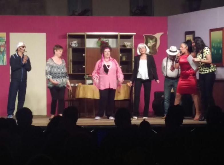 Su una scenografia raffigurante un tipico salotto italiano addobbato con le colorate opere di due pittori locali, Lucio Monaco e Giuseppina Di Saverio, tutti gli attori, bravi e particolarmente attenti alla resa linguistica dei vari dialetti, hanno interpretato egregiamente i vari personaggi, riconducibili a tipologie ben definite e riconoscibili: Gaetano, l’anziano ripetitivo ma simpatico, interpretato da Sandro Di Egidio; Iolanda, la figlia zitella un po’ avanti con l’età ma in attesa ancora di marito interpretata da Maria Assunta D’Elpidio; Doretta, l’amica marchigiana un po’ esuberante e appariscente interpretata da Tiziana Fioravanti, Stanislao Mirabilii nelle vesti dello strano tecnico dell’udito Piero, la dottoressa Frattacchia e la dottoressa Mariucci interpretate da Giuseppina Di Saverio; e infine la fisioterapista Ornella interpretata da Patrizia Paterna.
