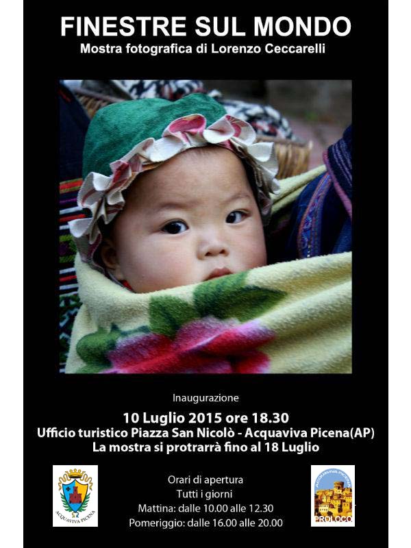 ACQUAVIVA PICENA – Verrà inaugurata Venerdì 10 Luglio alle ore 18.30 la mostra fotografica ‘Finestre sul Mondo’ dell’Ostrense Lorenzo Ceccarelli. L’esposizione, resa possibile grazie al patrocinio del Comune di Acquaviva Picena e della Pro Loco, si terrà nel chiostro dell’Ufficio Turistico situato in Piazza San Nicolò, nel centro storico del grazioso comune ascolano e sarà visitabile tutti i giorni fino al 18 luglio nei seguenti orari: la mattina dalle 10.00 alle 12.30, il pomeriggio dalle 16.00 alle 20.00; mercoledì 15 luglio, in occasione del Mercatino dell’artigianato e delle tipicità locali l’esposizione, sarà visitabile fino alle 24.00, nonché sabato 18 luglio la mostra sarà visitabile fino al termine della manifestazione “Notte Divina” che avrà inizio alle ore 19:00 e si protrarrà fino a tarda notte.