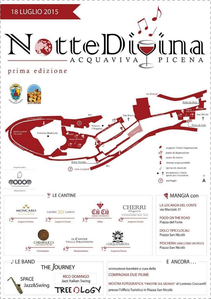 ACQUAVIVA PICENA – Si svolgerà nell’ambito di un’unica serata, precisamente sabato 18 luglio 2015, a partire dalle ore 19:00 in poi, la prima edizione di “Notte Divina”, organizzata dalla Pro Loco di Acquaviva Picena in collaborazione con il Comune di Acquaviva Picena, le Cantine locali, i ristoratori locali e le Associazioni locali