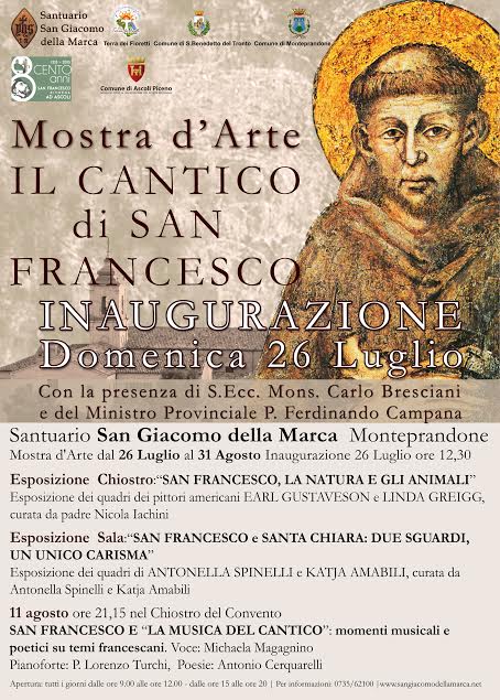 MONTEPRANDONE – In occasione degli 800 anni della venuta di San Francesco in Ascoli Piceno nel 1215, in uno dei suoi viaggi nella cosiddetta “Marca di Ancona”, a Monteprandone, il Santuario “San Giacomo della Marca” dei Frati Minori presenta nel periodo estivo la mostra: “Il Cantico di San Francesco”, un evento francescano che vuole ricordare questo importante anniversario, promosso dai Comuni di Monteprandone, Ascoli Piceno e San Benedetto del Tronto e dalla Provincia francescana “San Giacomo della Marca” dei Frati Minori delle Marche.