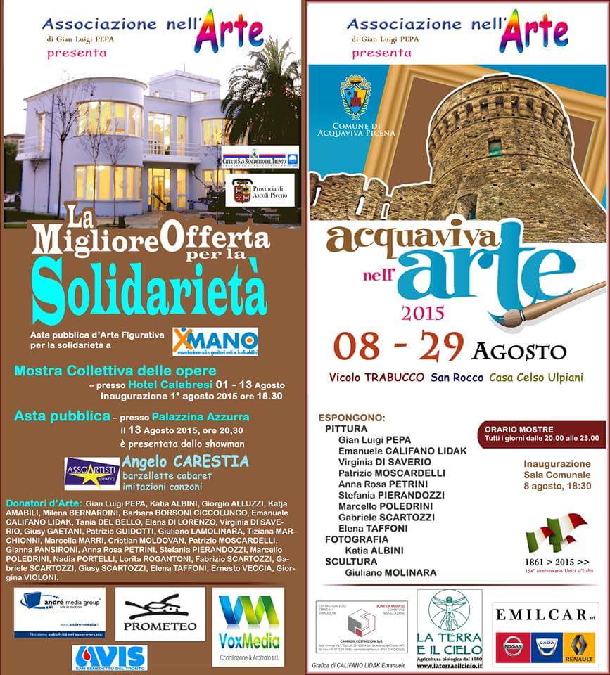 ACQUAVIVA PICENA e SAN BENEDETTO DEL TRONTO – L’Associazione “Nell’Arte” di Gian Luigi Pepa riparte con il nuovo programma degli eventi estivi, che quest’anno comprenderà due importanti manifestazioni, Acquaviva Nell’Arte 2015, che avrà luogo nel centro storico di Acquaviva Picena dall’8 al 29 agosto, e La Migliore Offerta per la Solidarietà che avrà luogo a San Benedetto del Tronto con la mostra presso l’Hotel Calabresi, e con un’asta di beneficenza presso la Palazzina Azzurra, dal 1 al 13 agosto.