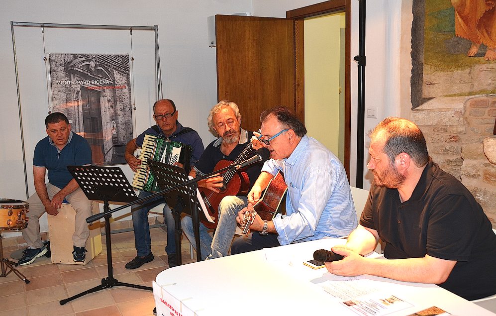 A questo punto, con una “BAND” messa su per l’occasione (Loris e Angelo alla chitarra, Gianni Antodicola alla Fisarmonica e Cristian Mostardi alle percussioni) si è potuto assistere ad un concerto (magari di pochi pezzi) di altissimo livello! Questa formazione ha eseguito “A valiscia de carto’ ” , con parole di Maurilio Beato, e “O vi’ de nonnu”, con parole di Innocenzo Ascenzi. E’ andata quindi la registrazione del pezzo “Sand’Andonio” con parole di Paolo Mariucci. Tutti i pezzi sono stati preceduti dalla lettura interpretativa di Giuseppe Mariucci (i primi due) e di Paolo Mariucci (l’ultimo).
