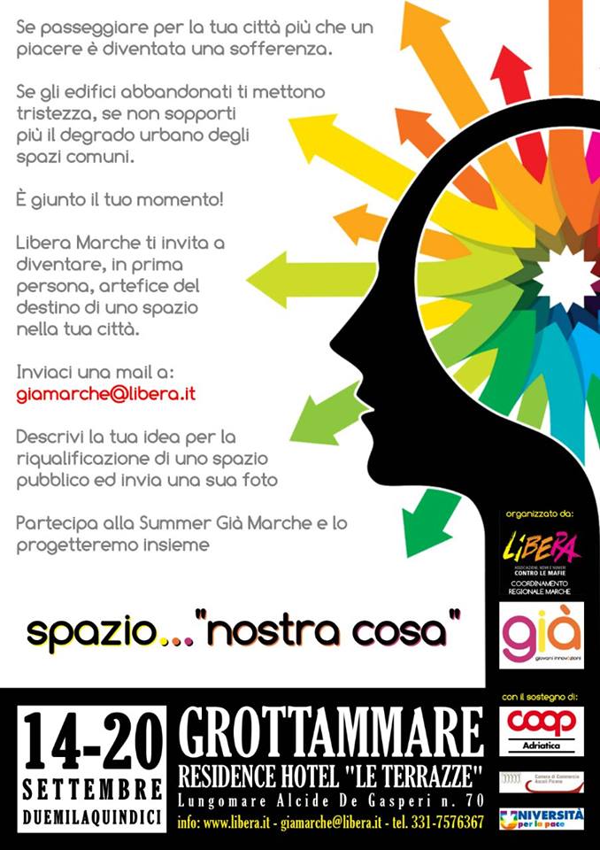 GROTTAMMARE: Scuola GIA’ – Giovani Innovazione è l’iniziativa di formazione di Libera che si svolgerà dal 14 al 20 settembre a Grottammare, rivolta a giovani che hanno voglia di condividere idee e progetti per valorizzare il proprio territorio. Libera, Associazione Numeri e Nomi contro le Mafie, organizza 6 summer school in tutta Italia, 4 sono al sud dove sono nate per riflettere sull’uso dei beni confiscati alla mafia, una viene realizzata al nord e una al centro Italia. L’unica proposta per il Centro Italia quindi si svolgerà a Grottammare anche perchè qui si trova un bene confiscato alla mafia.