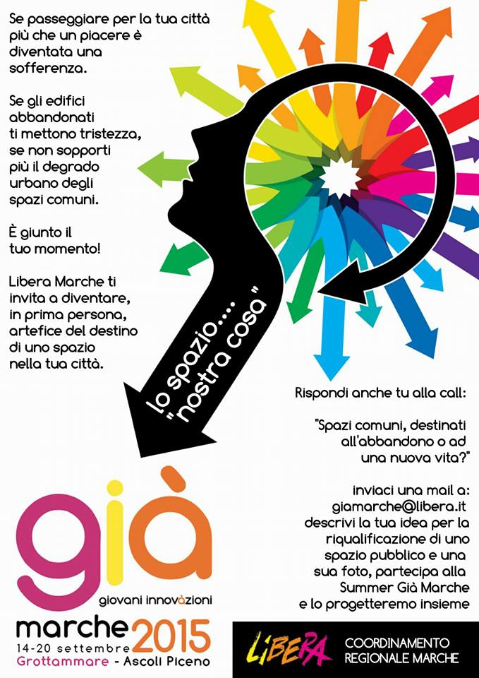GROTTAMMARE: Scuola GIA’ – Giovani Innovazione è l’iniziativa di formazione di Libera che si svolgerà dal 14 al 20 settembre a Grottammare, rivolta a giovani che hanno voglia di condividere idee e progetti per valorizzare il proprio territorio. Libera, Associazione Numeri e Nomi contro le Mafie, organizza 6 summer school in tutta Italia, 4 sono al sud dove sono nate per riflettere sull’uso dei beni confiscati alla mafia, una viene realizzata al nord e una al centro Italia. L’unica proposta per il Centro Italia quindi si svolgerà a Grottammare anche perchè qui si trova un bene confiscato alla mafia.