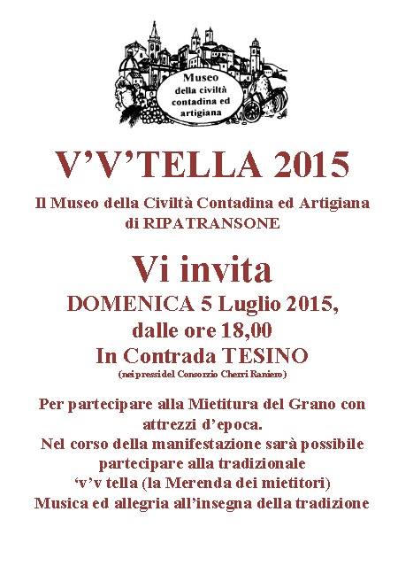 Nel pomeriggio di Domenica 5 Luglio, in Valtesino, il Museo della Civiltà Contadina ed Artigiana di Ripatransone ha organizzato l’ormai tradizionale “V’V’TELLA”, manifestazione per rievocare la merenda che i mietitori ricevevano dopo il duro lavoro della mietitura. Quest’anno siamo stati ospitati nel terreno di proprietà dei fratelli Luciano e Giuseppe Cannella che, insieme alle loro famiglie, hanno collaborato con grande passione ed amicizia, affinché questa manifestazione si potesse svolgere.