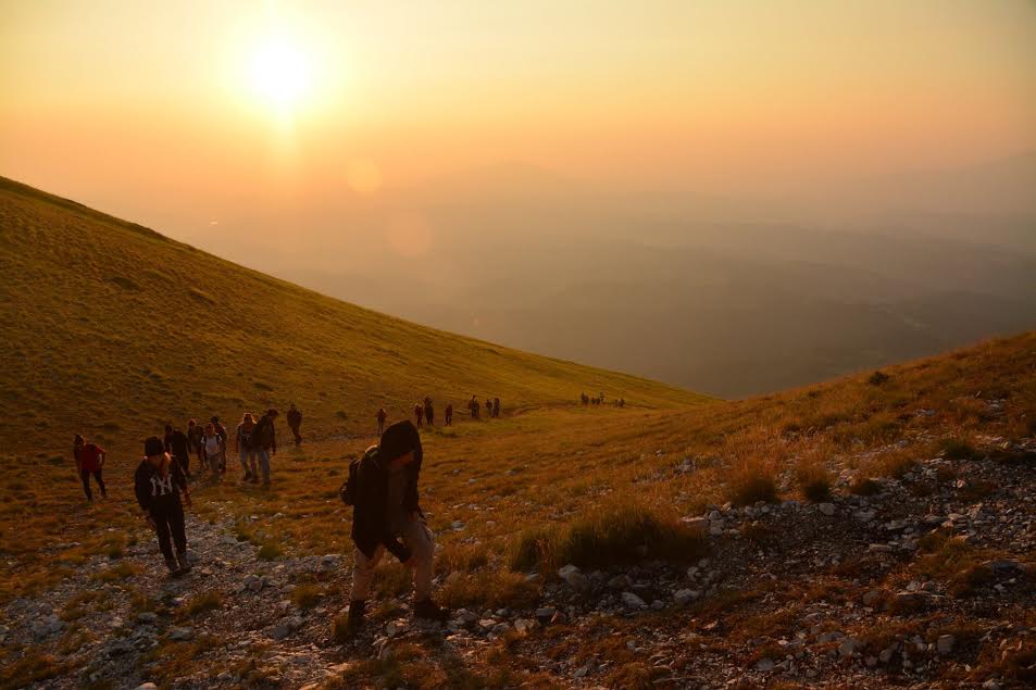 Le montagne dormono, e la luna non si è ancora nascosta, le stelle sono tutte lì a sorvegliare le nostre auto in fila indiana sul sentiero tortuoso e malmesso che porta al rifugio Sibilla. Ci accolgono i primi chiarori di un nuovo giorno, che brillano negli occhi dei nostri quaranta ragazzi che nonostante le differenze di età si sentono già una famiglia. Ci incamminiamo e quei chiarori si fanno luce, la montagna è ormai sveglia, e il sole è così speciale. Rosso, vivo, sicuro, pronto a illuminarci il cammino. Con le fotocamere è difficile rappresentare tanta Bellezza, ma la voglia di immortalare un momento così speciale è troppa. Più si sale più il fiato si fa corto, la testa gira, si inizia a sentire la fatica. Ma ci si fa forza, e la speranza di cui parliamo tanto si fa realtà. La speranza non si finge, perché “è una forza interiore di chi si nutre dell’Amore di Dio per donarlo agli altri”. Nel punto più critico ci si tende la mano, ci si incoraggia, e i nostri occhi non più assonnati sono volti alla vetta. Dall’alto di 2173 metri viene spontaneo proclamare le Lodi, così vicini a Lui, che ci riempie il cuore con le Sue creazioni perfette regalandoci così tanta Bellezza.