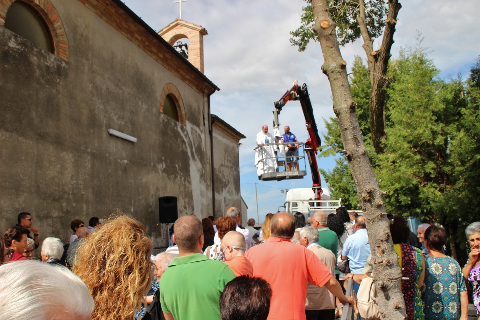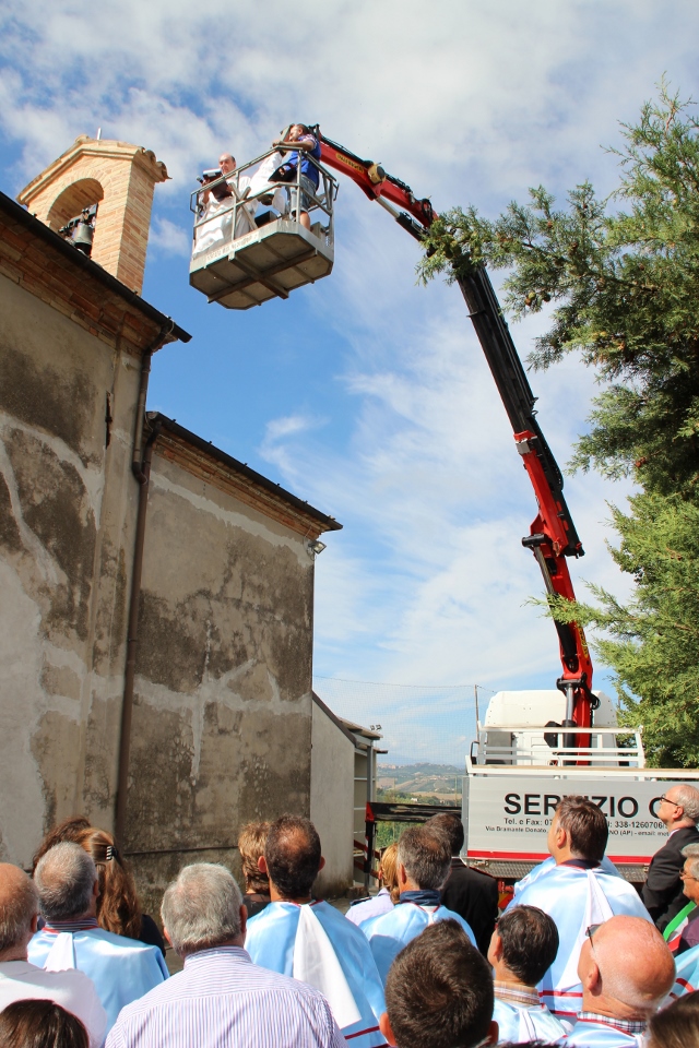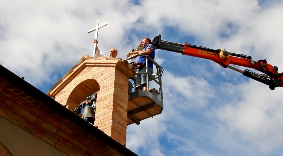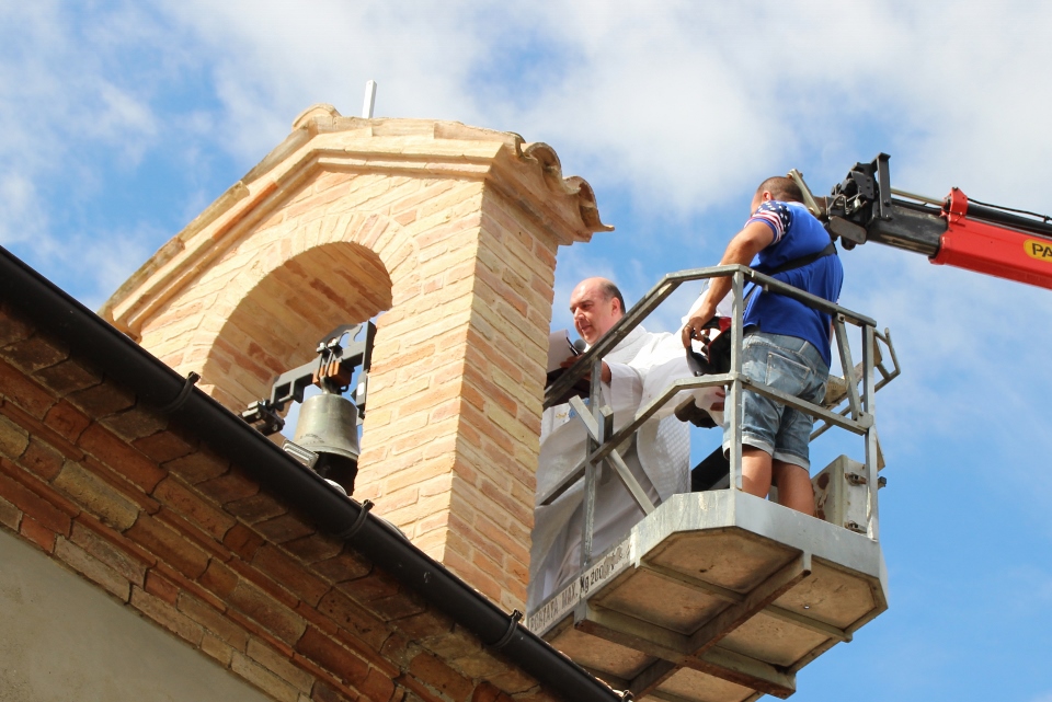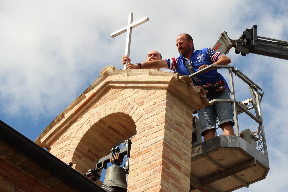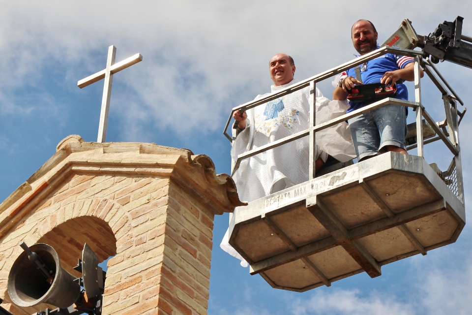 Al termine della celebrazione Eucaristica, Don Nicola si è recato con un cestello meccanico sul tetto della chiesa per benedire nuovamente, secondo l’apposito rituale, l’antica campana del 1908, ed issare una piccola croce sulla sommità della struttura.