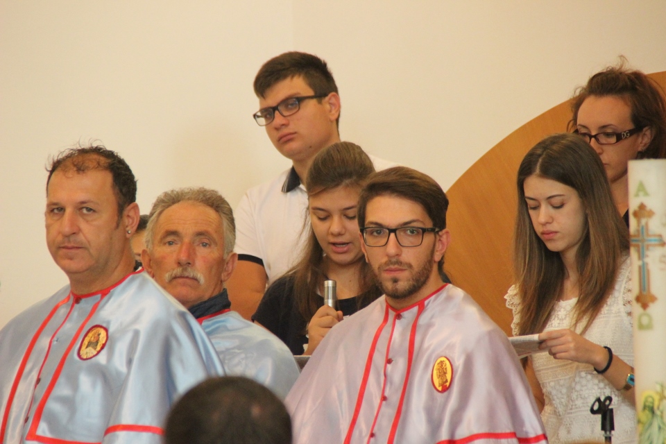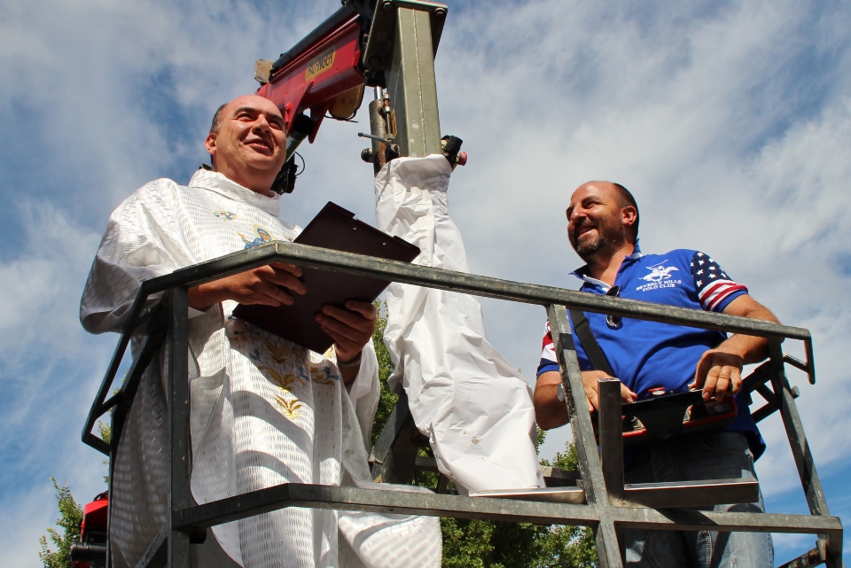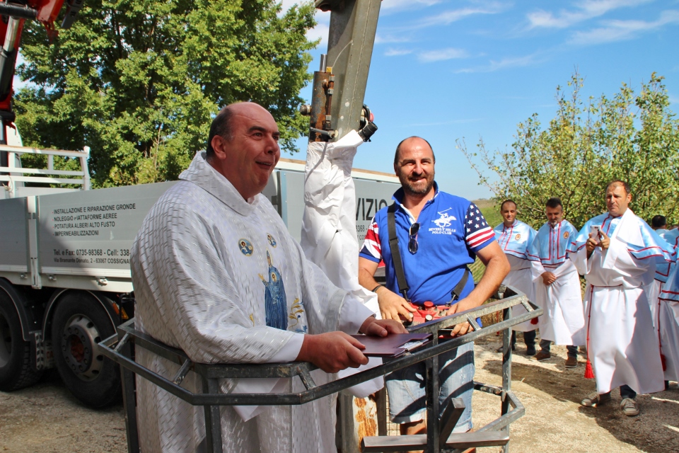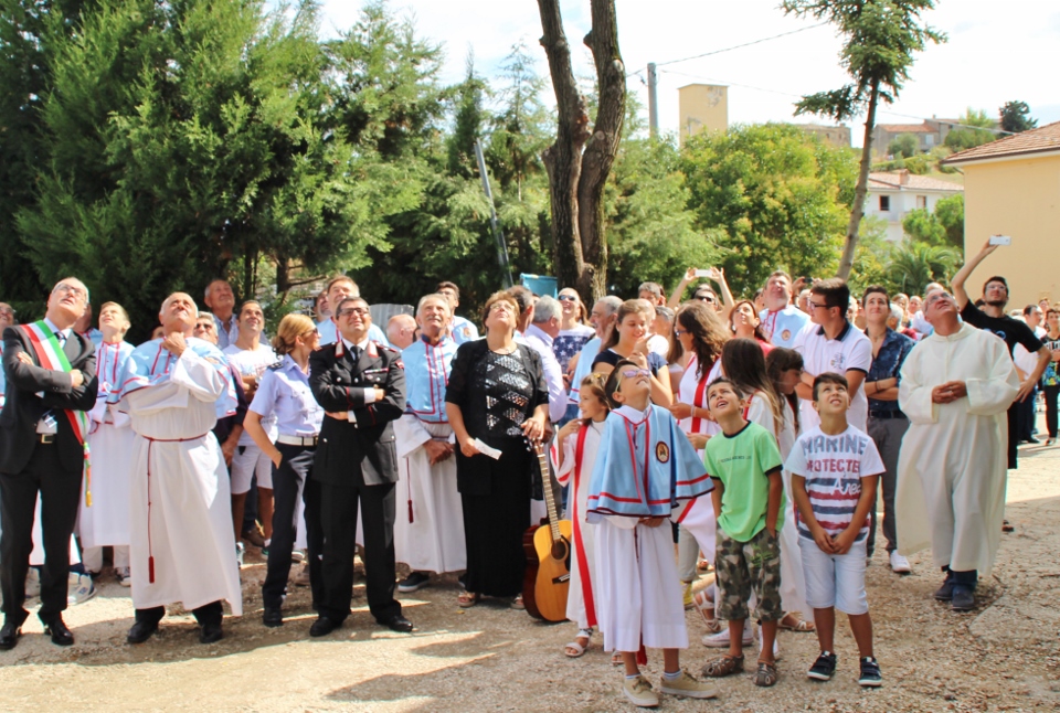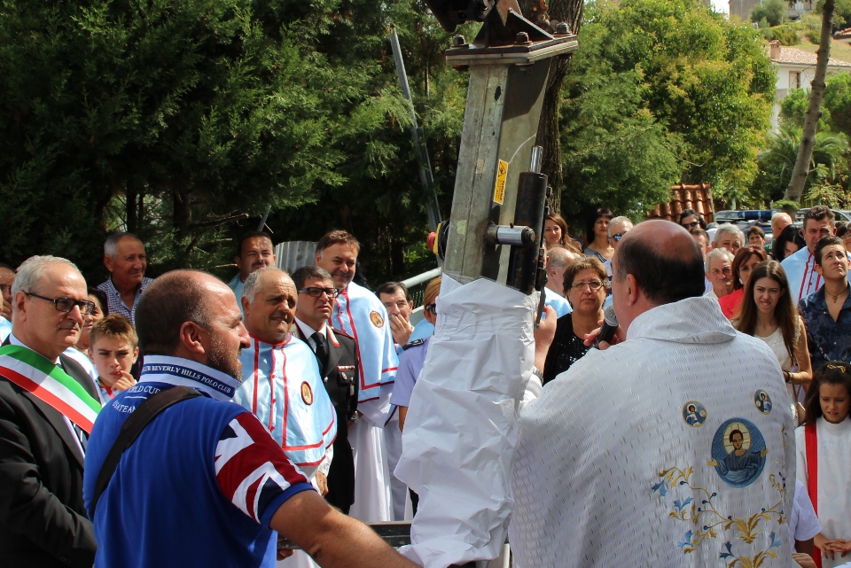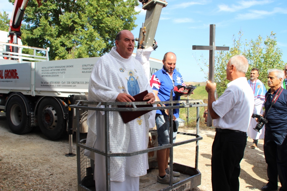 Al termine della celebrazione Eucaristica, Don Nicola si è recato con un cestello meccanico sul tetto della chiesa per benedire nuovamente, secondo l’apposito rituale, l’antica campana del 1908, ed issare una piccola croce sulla sommità della struttura.