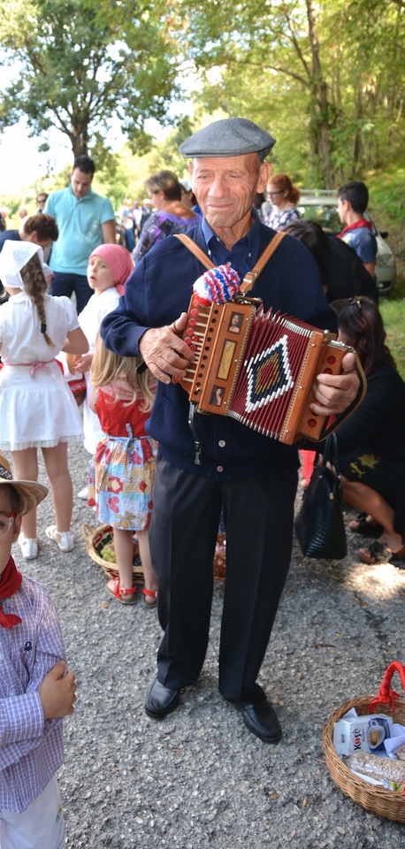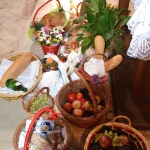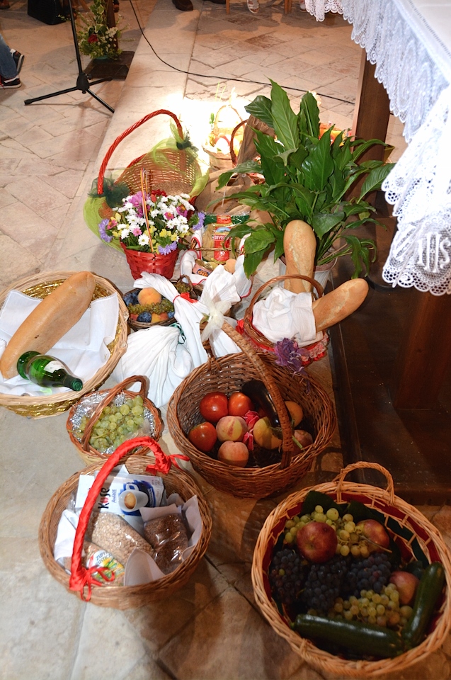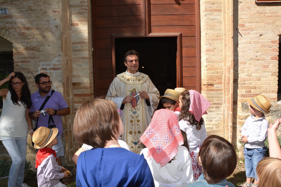 Quindi l’avvenimento centrale di tutta la festa: la rievocazione storica dell’offerta delle “canestrelle” alla Madonna di Santa Maria in Camurano! Qui è avvenuto, anche quest’anno e ancora una volta, ciò che da centinaia di anni si ripete: le offerte dei prodotti dei nostri campi alla Madonna che si venera in una delle Chiese rurali più importanti e artisticamente dotata delle nostre zone! I bambini, che indossavano riproduzioni di vestiti d’epoca, hanno recato alla Madonna ognuno, nei propri cestini, frutta, grano, ortaggi, fiori coloratissimi e variopinti e altro ancora! Il Priore-Parroco di San Michele Arcangelo di Montelparo, padre Agostino Maiolini, ha accolto la processione, che si era formata e che era guidata, rigorosamente, dal suonatore di organetto (Lino Passamonti) con tutti questi bambini e i loro familiari, all’ingresso della chiesa. Le offerte, sempre in processione questa volta all’interno del Santuario guidata dal sacerdote, sono state deposte con devozione sotto l’altare centrale. I canti della Corale Petrocchini di Montelparo hanno accompagnato la cerimonia. La festa continuava, fino a che il buio non aveva il sopravvento, con musica, canti, giochi e, ovviamente, ….specialità gastronomiche!