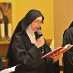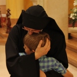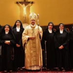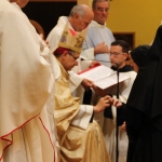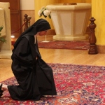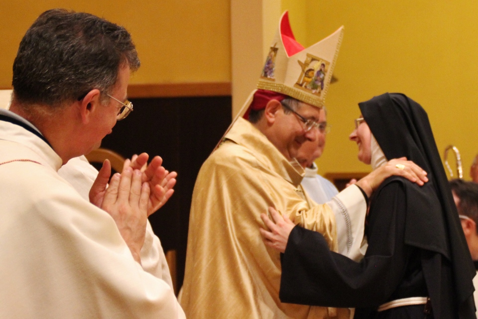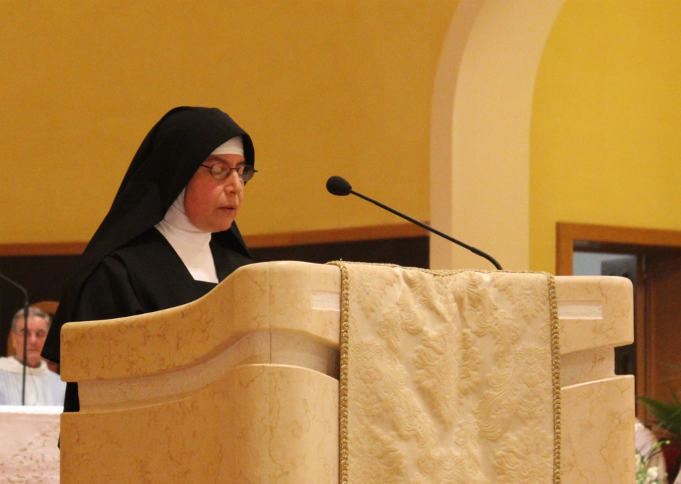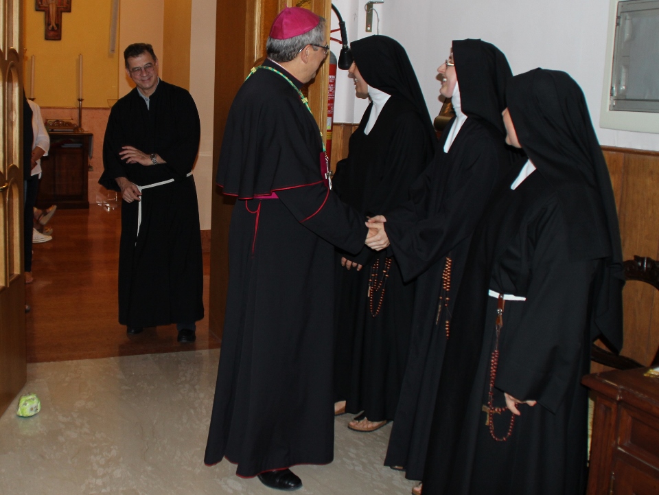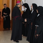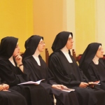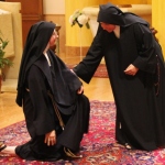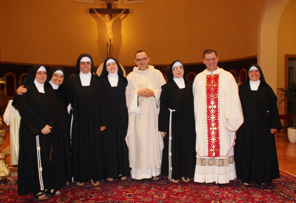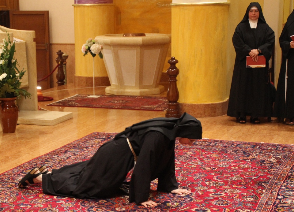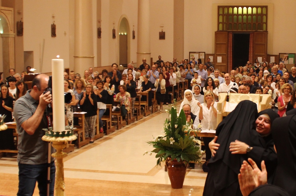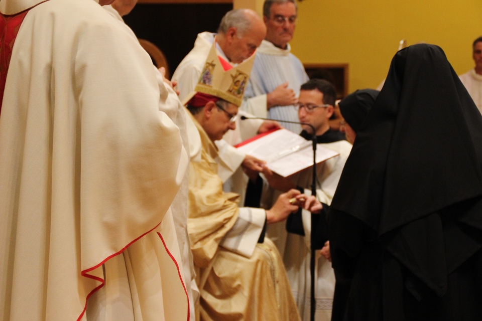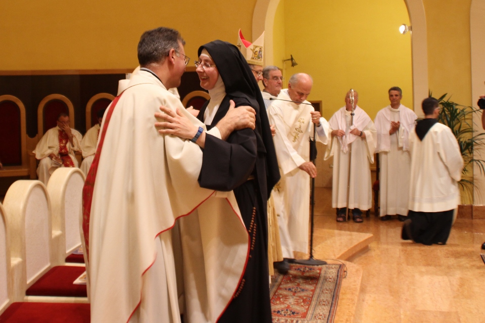 Soprattutto, cara Sr. Massimiliana, il mondo lo porti dentro di te, dentro la tua storia. Ti sei messa in cammino seguendo l’invito di Cristo sposo, ma Lui è là davanti a te che prega il Padre, come ci ha detto nel Vangelo, perché vuole che tu sia dove è lui (cfr. Gv 17, 24). Il deserto non è il monastero dal punto di vista fisico, ma l’essere soli con Dio, il fare di Lui solo l’amore della tua vita. Questa libertà è una conquista di grazia, non è il punto di partenza; è frutto di una sequela costante e diuturna. Si tratta di una meta che potrai raggiungere solo se terrai lo sguardo fisso su di Lui e ti lascerai guidare dalle mani amorevoli della Chiesa, che accoglie questa sera i tuoi voti perpetui e ti accompagna donandoti ogni giorno la luce della Parola che illumini i tuoi passi (cfr. Ps 118, v. 105), così da non perderti per via, attratta da falsi miraggi che possono entrare anche dentro il monastero. Ricordati che la meta è il Signore, ma il cammino verso di Lui è sempre in compagnia della Chiesa e delle sorelle che hai accanto.