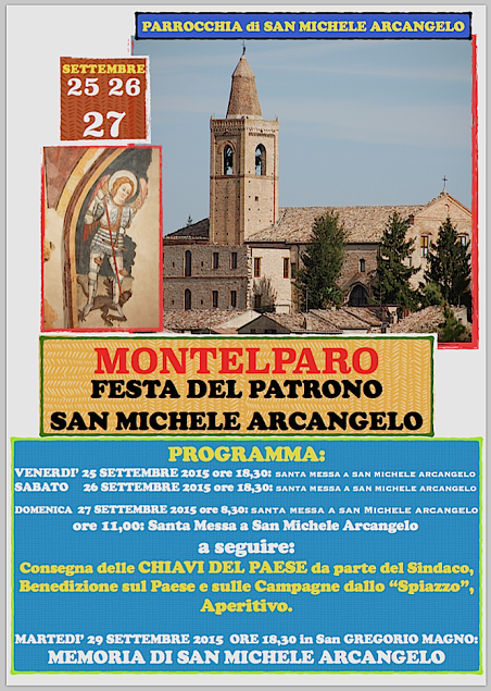 MONTELPARO – Anche quest’anno si svolgeranno, nelle date del 25, 26 e 27 settembre prossimi nella Chiesa di San Michele Arcangelo, i festeggiamenti per la ricorrenza del patrono di Montelparo: San Michele Arcangelo appunto! Anche questa volta si ripeterà, come oramai da alcuni anni a questa parte, la simbolica consegna delle chiavi del paese all’Arcangelo Michele da parte del Sindaco.