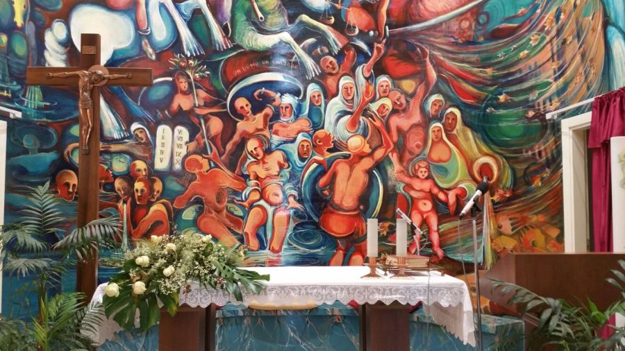 L’edificio presenta una sola navata e subito lo sguardo viene attratto da un dipinto che domina il fondo del piccolo abside: si tratta di un affresco dipinto nel 1996 dal pittore ascolano Leopoldo Tomassini che raffigura con toni accesi e forti contrasti cromatici il tema dell’Apocalisse. Ad oggi, purtroppo, sono visibili sulle pareti interne alcuni segni lasciati dal terremoto del 2009 e un’alta scala testimonia un problema all’orologio e alle campane dovuto alla caduta di un fulmine durante un temporale di qualche tempo fa.