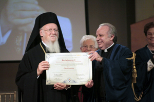 “È normale e naturale che mi senta felice e commosso di avere il primo dottorato honoris causa che l’Istituto universitario Sophia ha voluto dare a me. Io sono il primo ma la mia gioia è il messaggio che Papa Francesco, mio fratello molto amato, ha voluto indirizzarmi stasera che rende la mia felicità molto più grande e sentita. Attraverso il suo messaggio il Papa ha voluto onorarmi ancora una volta di più. Ha voluto anche esprimere in questa occasione la sua determinazione a lavorare per l’unità delle nostre chiese sorelle. Da nostra parte e cioè da parte del Patriarcato ecumenico, sono felice di poter assicurare Sua Santità e voi tutti che mi ascoltate della simile determinazione della nostra Chiesa di Costantinopoli di far progredire il dialogo ecumenico in genere ma in particolare tra la Chiesa ortodossa e la Chiesa cattolica perché noi siamo Chiese sorelle, perché noi abbiamo tante cose in comune, perché siamo molto più vicini che con altre chiese e denominazioni cristiane e perciò dobbiamo avanzare. Questo era il messaggio che il Papa ci ha dato venendo a Costantinopoli l’anno scorso nella nostra festa patronale. Questo è il desiderio comune che abbiamo espresso a Gerusalemme nel maggio 2014 quando ci siano incontrati in Terra Santa per celebrare il 50° anniversario dell’incontro storico dei nostri predecessori. Già all’inizio del suo Pontificato, quando ho avuto la gioia di essere presente personalmente al suo insediamento e abbiamo avuto una mezza ora di incontro privato, abbiamo detto che dobbiamo lavorare e pregare intensamente per l’unità delle nostre chiese, per la ricomposizione dell’unità del corpo di Cristo che è la Chiesa. Questa sera, avendo la sua determinazione rinnovata con il suo messaggio, mi sento felicissimo e tornerò a Istanbul domani sera più forte, più sicuro di avere a Roma un fratello che desidera tanto lavorare con noi e pregare per far accelerare l’unità delle nostre Chiese”.