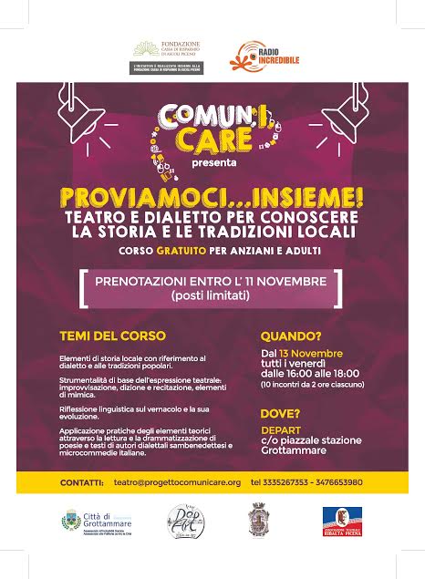 Il corso che si terrà presso il DepArt, centro di aggregazione situato all’interno del parcheggio della stazione ferroviaria di Grottammare, sarà animato da alcuni soci del Circolo dei Sambenedettesi che presenteranno tematiche di carattere storico basate sulle tradizioni e la lingua locale. La parte più prettamente teatrale sarà invece a cura dell’ Associazione Teatrale “Ribalta Picena” che, diretta dal regista Alfredo Amabili, proporrà una serie di brevi testi letterari da drammatizzare tratti dai grandi poeti come Spina, Piacentini e Vespasiani per il dialetto o, per i testi in lingua, le esilaranti microcommedie di Achille Campanile.