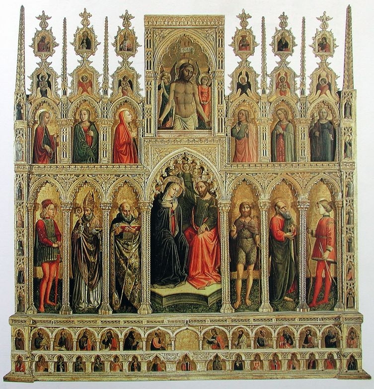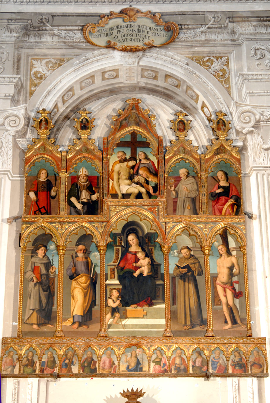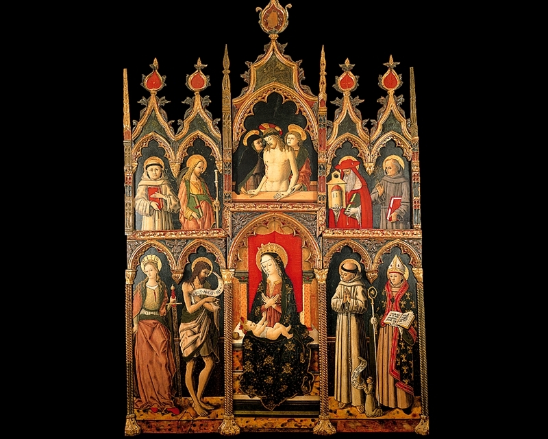 MONTELPARO – Nella Sala VI della Pinacoteca Vaticana (facente parte dei Musei Vaticani) è esposto il grande Polittico di Niccolò Liberatore, detto l’ALUNNO, denominato “INCORONAZIONE DELLA VERGINE”. Questo polittico è detto anche “IL POLITTICO DI MONTELPARO”: la guida della Pinacoteca Vaticana precisa che esso proviene dalla Chiesa di San Michele Arcangelo di Montelparo e fu acquistato da Papa Gregorio XVI nel 1844 per poi essere trasferito e sistemato alla Vaticana sotto il Pontificato di Pio IX! Questo polittico appare come il meglio conservato di quelli dell’ALUNNO ed è anche quello che ancora oggi ci offre l’originaria bellezza. Ha una struttura assai complessa, costituita da due ordini orizzontali di sette scomparti ciascuno, oltre a due paraste laterali e una predella ed è sormontato da sei pinnacoli. Eseguito forse per la chiesa degli Agostiniani a Montelparo, che all’epoca era anch’essa in Piazza Bramante, fu trasferito in quella vicina di S. Michele Arcangelo a seguito del terremoto del 1703.