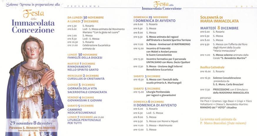 SAN BENEDETTO DEL TRONTO – In occasione della novena dell’Immacolata Concezione che da anni vede la partecipazione di molti fedeli, presso la parrocchia di S. Benedetto Martire, lunedì 30 novembre, alle ore 21,00, ci sarà la Celebrazione Eucaristica animata dalle famiglie della Diocesi che vorranno stringersi intorno a Gesù Eucarestia e intorno alla Madonna per pregare per le nostre famiglie, per quelle di tutto il mondo e per la pace, in questo momento particolare. Sentiamoci chiamati a titolo particolare a contemplare il volto di Cristo alla scuola di Maria.