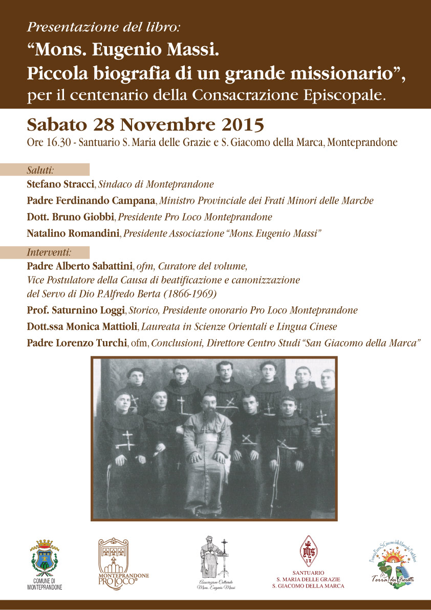 Alle ore 16.30, presso il Santuario di S. Giacomo della Marca, l’Associazione Monsignor Eugenio Massi, in collaborazione con la Proloco ed il patrocinio dell’Amministrazione Comunale di Monteprandone, presenta il libro “Mons. Eugenio Massi. Piccola biografia di un grande missionario”.
