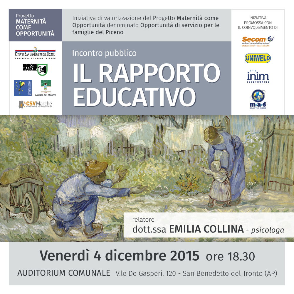 SAN BENEDETTO DEL TRONTO – Il centro culturale “La Mongolfiera” ha organizzato un incontro sul tema “Il rapporto educativo”. L’appuntamento è per venerdì 4 dicembre alle ore 18.30 presso l’Auditorium Comunale Tebaldini. La psicologa Emilia Collina terrà una relazione sul tema e risponderà alle domande proposte dal pubblico.