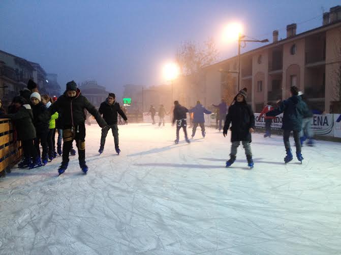 COMUNANZA – Ha preso il via sabato 5 dicembre nella suggestiva Piazza Garibaldi la pista di pattinaggio sul ghiaccio, l’accattivante scenario che accoglierà i comunanzesi e chiunque voglia fare “un salto a Comunanza”, appassionati e non. Ice Park Sibillini così denominata “vivrà” fino al 6 Gennaio, ogni giorno, festività comprese. Dopo il successo dello scorso anno, con centinaia di persone che hanno scelto Comunanza per trascorrere un giorno spensierato pattinando, il village 2015/2016 sarà ancora più grande e ricco di proposte, con moltissime novità. Oltre alla pista di pattinaggio di ben 400 mq a lastra naturale, con la capienza di ben 100 pattinatori, vedremo offrire servizi, manifestazioni, iniziative musicali, arte di strada, enogastronomia, animazione e concorsi a premi. l’Ice Park sarà un punto di riferimento assoluto per tutte le fasce di età. Particolare attenzione quest’anno sarà rivolta alle famiglie, attraverso l’istituzione dei “Family Ice Day”: giornate, cioè, in cui sono previsti ingressi gratuiti per i bambini accompagnati in pista dai genitori. Da quest’anno anche il primo “Torneo di Curling Nostrano”: una reinterpretazione della celebre disciplina olimpica, che vede in opera “attrezzature domestiche” (dal ferro da stiro allo spazzolone). Non poteva mancare “Selfie&Co”, concorso fotografico per attività sul ghiaccio girando con i personaggi delle fiabe e i giochi di società. Un mese ricco di proposte alternative, arricchite in tutti i fine settimana per dar vita a momenti di divertimento durante tutte le festività. L’affluenza in questa prima giornata è stata ottima, pattinatori di tutte le età, che hanno girato in pista fino a tarda serata incuranti del tempo che passava inesorabilmente.