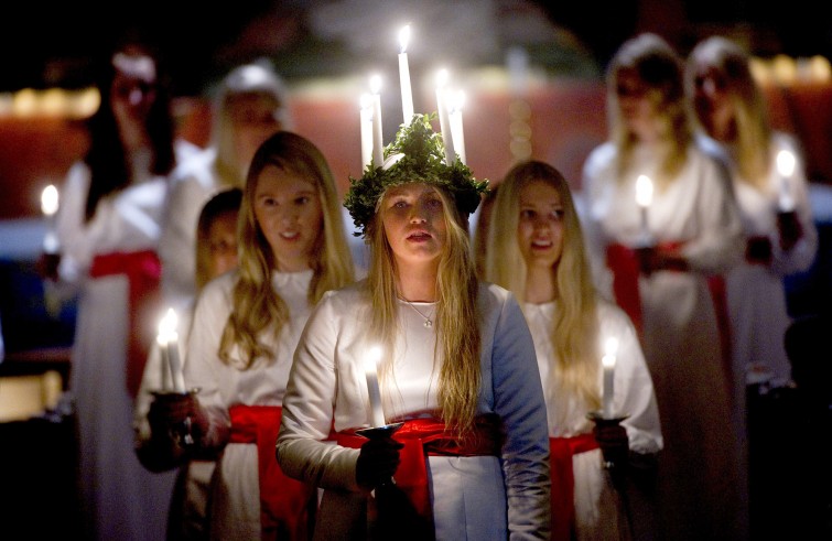 In Finlandia e in Norvegia. Tradizione vuole che il 13 dicembre, di primo mattino, un corteo di giovani fanciulle vestite in abiti bianchi cinti da un nastro rosso e con le candele in mano, avanzi cantando attraverso i luoghi di lavoro, le scuole, le chiese e a volte anche per le strade delle città. A guidare la processione è una giovane prescelta, la novella santa Lucia, che porta sul capo una corona di candele.