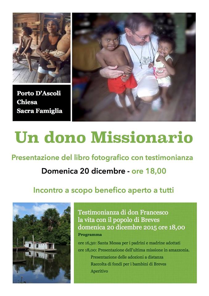 Don Francesco dichiara: “Dopo il mio ultimo viaggio in Amazzonia desidero condividere con chi è interessato la mia esperienza umana e spirituale. Nell’occasione chi vuole potrà lasciare una offerta per i bambini adottati oppure adottare a distanza uno di questi piccoli. Al termine sarà offerto un piccolo aperitivo. Un modo per prepararsi al Natale. Condividete e invitate i vostri amici.