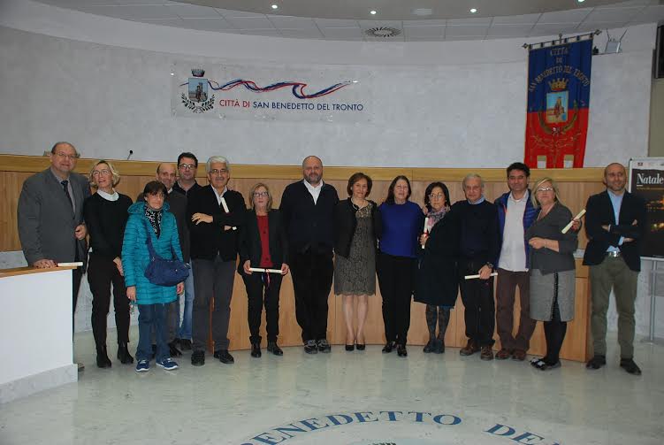 SAN BENEDETTO DEL TRONTO – Come consuetudine, prima delle festività natalizie, questa mattina, martedì 22 dicembre, si è svolta in sala consiliare la tradizionale cerimonia di premiazione dei dipendenti comunali che sono andati o andranno in pensione entro il 2015. Sono dieci i dipendenti che hanno ricevuto dalle mani del sindaco Giovanni Gaspari un attestato in segno di riconoscenza per il lavoro svolto: Renata Brancadori, Tonino Brandimarte, Maria Capecci, Anna Maria Fazzolari, Secondo Ferracuti, Raffaella Lamponi, Mario Laureati, Mario Palanca, Gino Sprecacè, Serenella Verdecchia.