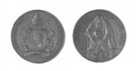 Con un diametro di 50 millimetri e un peso di 85 grammi, la medaglia è incastonata in una scultura fusa in bronzo, ornata su entrambi i lati con tralci d’uva che rappresentano l’Eucaristia e richiamano il Popolo di Dio, la “vigna del Signore” e il pavone che, nell’iconografia cristiana antica, è simbolo della risurrezione e della vita eterna. La cornice in bronzo è stata modellata dalla scultrice e medaglista Daniela Fusco.