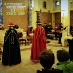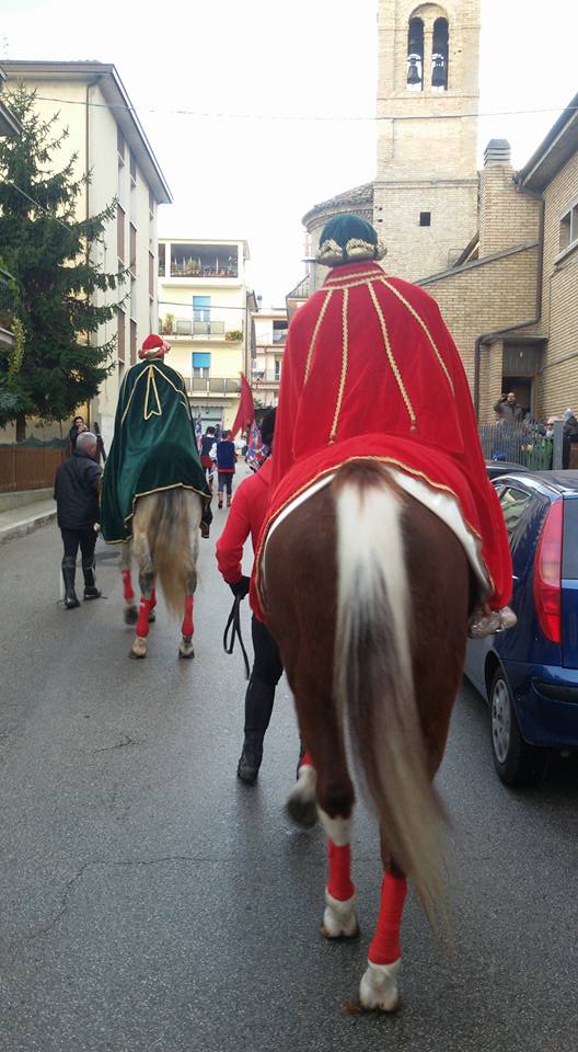 SAN BENEDETTO DEL TRONTO – La prima domenica del 2016 alla SS. Annunziata ha visto l’arrivo dei Re Magi a cavallo e al suono dei tamburi. I Re Magi hanno ascoltato le letterine e le domande dei bambini presenti. Al termine, sul sagrato della Chiesa ha anche debuttato il neocoro dei cantori di S. Antonio della Parrocchia Ss. Annunziata. Con mantella e cappello, il gruppo insieme allo stesso don Anselmo che ha promosso la realizzazione di questo coro, hanno intonato alcuni canti popolari legati alla tradizione, e si ritroveranno per le strade della parrocchia, fino anche al centro commerciale Porto Grande, in queste due settimane che precedono la festa di S. Antonio.