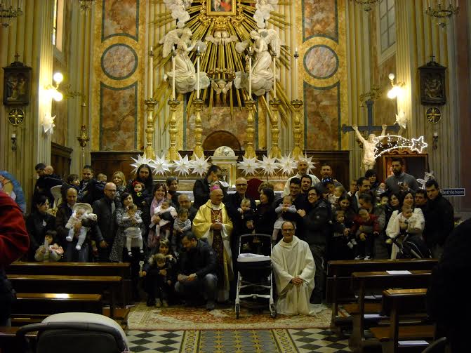 Così la Celebrazione Eucaristica è stata allietata dai sorrisi dei 21 bambini e dalle mille speranze che albergano nel cuore dei loro genitori visivamente emozionati quando il parroco ha consegnato loro un piccolo ricordo della giornata dopo averli chiamati uno per uno: Mattia di Valentino e Silvia, Angelica di Simone e Nadia, Giulia Manuela di Marco e Giovanna, Alessandro di Roberto e Sara, Marco di Andrea e Arianna, Sebastian di Livio e Angela, Mia di Matteo e Elettra, Christian di Augusto e Antonella, Tommaso di Emanuele e Elsa, Anita di Simone e Daniela, Michele di Gabriele e Valeria, Matteo di Domenico e Chiara, Chiara di Stefano e Ilenia, Alessio di Vincenzo e Marina, Giorgio di Mario e Cinzia, Gaia di Giovanni e Rosita, Jacopo di Lorenzo e Elisabetta, Mattia di Sergio e Laura, Arianna di Lucio e Ilaria, Sofia di Pietro e Alina, Elena di Piero e Dina.