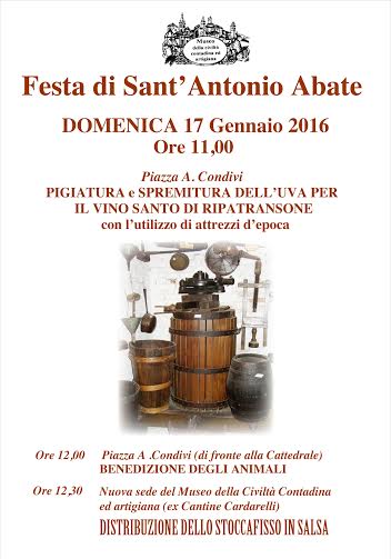 Infatti domenica 17 gennaio, i Soci del Museo della Civiltà Contadina, saranno impegnati nel rievocare i momenti più importanti della nostra tradizione iniziando alle ore 11.00, in Piazza Ascanio Condivi, con la spremitura dell’uva per il Vino Santo di Ripatransone.