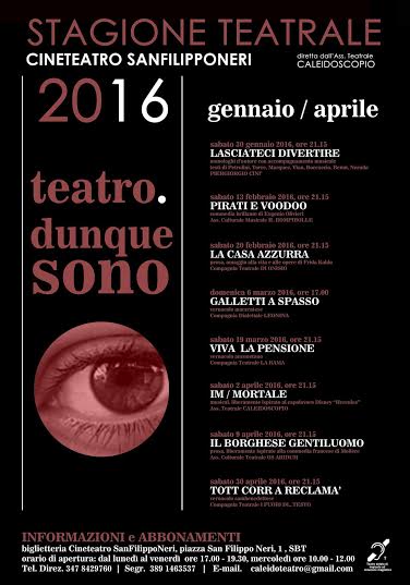 A partire da sabato 30 gennaio andranno in scena numerose compagnie teatrale: dal monologo d’autore “Lasciateci divertire” di Piergiorgio Cinì, alla brillante commedia di Eugenio Olivieri “Pirati e Voodoo” il 13 febbraio. E ancora, il 20 febbraio un omaggio alla vita e alle opere di Frida Kahlo con “La casa azzurra” a cura della compagnia teatrale Di Onisio.