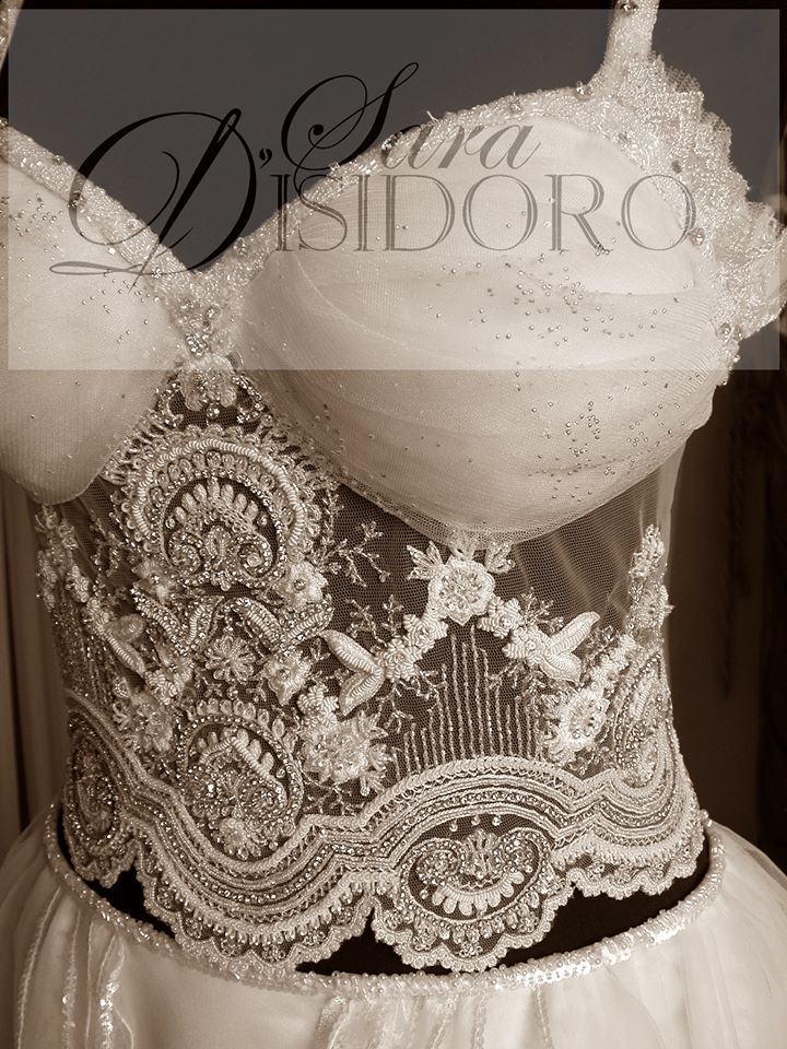 Perché scegliere noi? Innanzitutto, per l’alta qualità sartoriale. La lunga esperienza sartoriale che mi è stata tramandata, unita ai miei studi, garantiscono alla sposa la creazione di un abito dalla perfetta vestibilità. Viene scelto il modello dell’abito insieme a me, in base allo schizzo, alle prove degli abiti della mia collezione, o in base ai gusti della sposa. Vengono prese le misure direttamente sulla sposa e viene realizzato il modello e il prototipo su quelle misure. L’abito viene misurato sulla sposa dalle mani che lo hanno realizzato: in prova viene sdifettato, si decidono insieme le lunghezze, i tagli, la lunghezza dello strascico, lo scollo. L’abito viene, cioè, creato addosso al corpo della sposa. Nel nostro sito internet www.saradisidoro.it è possibile approfondire questo argomento consultando la sezione “come lavoriamo”. Poi, il nostro atelier appartiene alla categoria del “vero Made in Italy”. I nostri abiti vengono creati artigianalmente nella nostra sede in Abruzzo, i tessuti sono made in Italy, i capi vengono cuciti da mani italiane e tutte le fasi di lavoro avvengono nella stessa sartoria. Fino all’ultimo cerchiamo di non cedere alla tentazione a cui ormai da anni hanno ceduto la maggior parte dei produttori: l’importazione degli abiti da sposa dall’estero. A volte le spose non ne sono al corrente e si lasciano “ingannare” da abiti fotografati addosso a modelle bellissime e in scenari grandiosi. Ma non ci sarebbe nulla di male se questi abiti venissero dichiarati come tali: il vero problema è che abiti prodotti all’estero al prezzo di 290,00 – 300,00 euro vengono venduti con la denominazione made in Italy negli atelier italiani con dei ricarichi altissimi, e soprattutto nella totale disinformazione delle spose. In altri casi gli abiti da sposa vengono venduti su internet direttamente dai produttori esteri, sempre a prezzi bassissimi! Anche in questo caso, in foto, gli abiti sembrano pazzeschi, di alta sartorialità, ecc, ma in realtà la qualità è nettamente inferiore rispetto all’effetto delle foto! Ovviamente con questo discorso non voglio includere tutte le sartorie che portano avanti seriamente il proprio lavoro. La nostra sartoria, comunque, si rivolge alle spose che cercano un abito di alta qualità sartoriale, con tessuti pregiati, per un vero made in Italy. Poi, altri aspetti per i quali secondo me le ragazze in cerca di un abito da sposa dovrebbero rivolgersi a noi sono ad esempio l’estrema versatilità nella scelta del modello (visto che possiamo letteralmente realizzare l’abito dei sogni spaziando su infinite possibilità stilistiche, di tessuto ecc..) insieme all’opportunità, da non sottovalutare, di essere in diretto contatto con chi realizza l’abito e infine per la disponibilità di varie fasce di prezzo, che dipende molto dalla complessità del modello, dai ricami, dai metraggi dei tessuti, e anche dalla taglia della cliente e può oscillare in media tre le ottocento e le settemila euro.