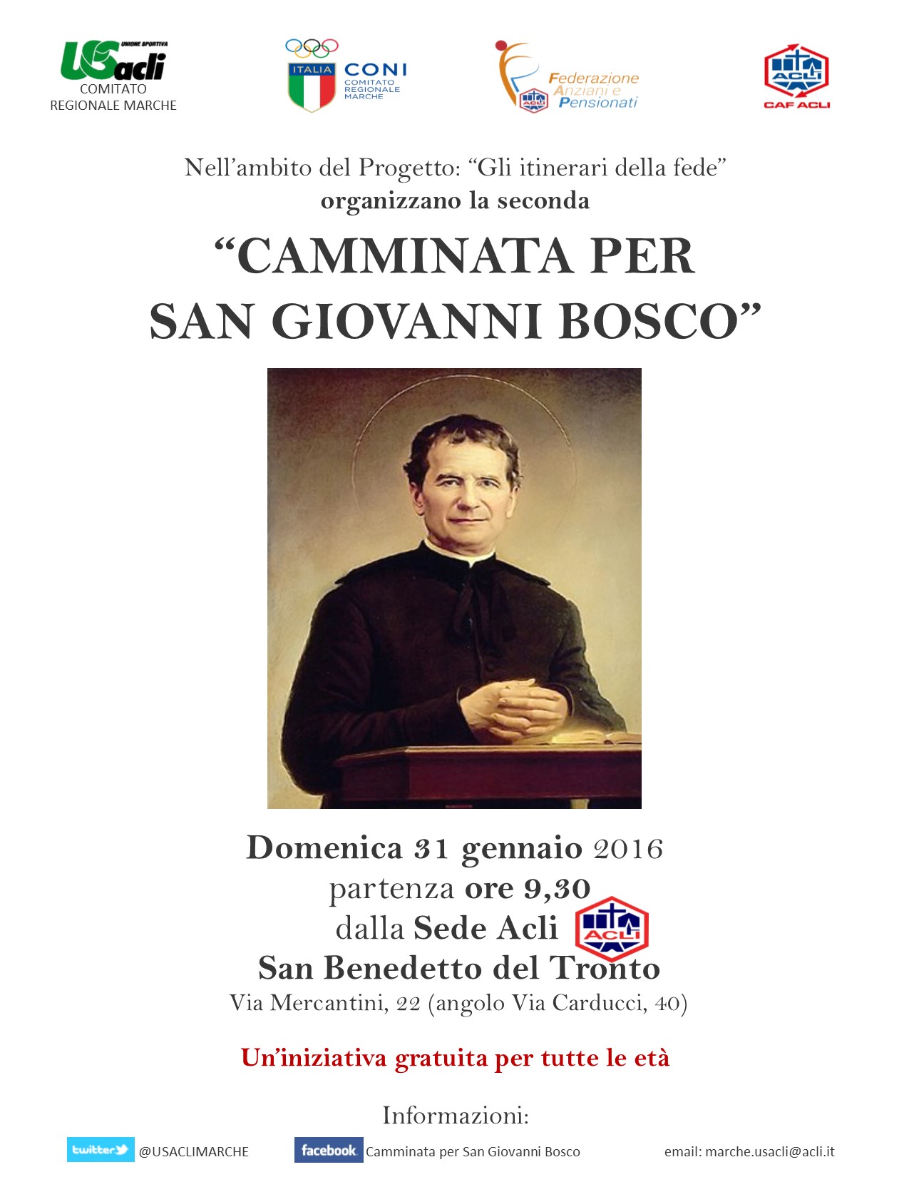 SAN BENEDETTO DEL TRONTO – E’ in programma per domenica 31 gennaio, con partenza dalla sede Acli in via Mercantini angolo via Carducci, la seconda edizione della “Camminata per San Giovanni Bosco”, iniziativa organizzata dall’Unione Sportiva Acli Marche in collaborazione con Federazione anziani e pensionati Acli e con il Caf Acli.