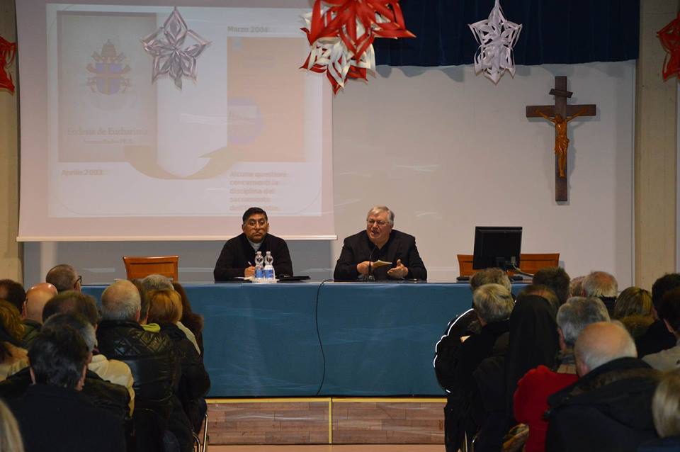 DIOCESI – E’ iniziato ieri sera presso il Biancazzurro il nuovo corso di formazione rivolto ai Ministri straordinari della Comunione della nostra Diocesi. L’incontro è stato guidato da don Mario Cataldi Parroco di S. Giacomo della Marca in Ascoli Piceno e Direttore della Commissione Liturgica Regionale. A partire dai documenti conciliari quali la Sacrosantum Concilium e dall’Istruzione “Redemptionis sacramentum, su alcune cose che si devono osservare ed evitare circa la Santissima Eucaristia”, don Mario ci ha guidato alla riscoperta della Celebrazione Liturgica. Il percorso è stato svolto anche a partire dall’architettura sacra: la struttura delle antiche chiese che aiutava il popolo a costituirsi come assemblea liturgica per meglio seguire la celebrazione stessa facendo esperienza della presenza di Cristo.