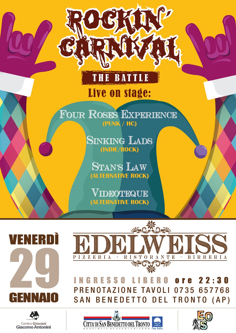 SAN BENEDETTO DEL TRONTO – Dopo il successo di “Rockin Christmas”, il CentroGiovani Giacomo Antonini (in collaborazione con l’ Edelweiss, l’Assessorato alle Politiche Giovanili e la EOS Coop) torna con “Rockin Carnival – The Battle”, un carnevale rock dedicato alle giovani band musicali del territorio.