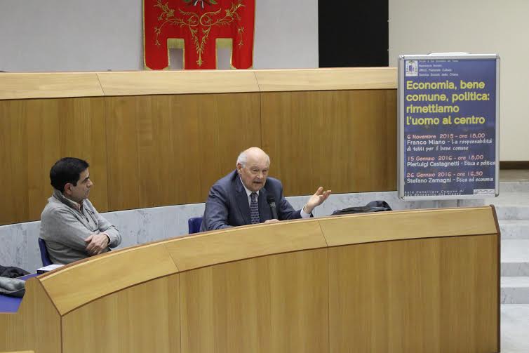 SAN BENEDETTO DEL TRONTO – E’ stata veramente una lezione di economia molto stimolante e partecipata quella tenuta dal prof. Stefano Zamagni illustre economista italiano, professore all’Università di Bologna, sul tema “Etica ed economia” presso l’aula consiliare del Comune di San Benedetto del Tronto martedì 26 gennaio in occasione del terzo ed ultimo incontro del corso di formazione organizzato dall’Ufficio Cultura della Diocesi di San Benedetto del Tronto.