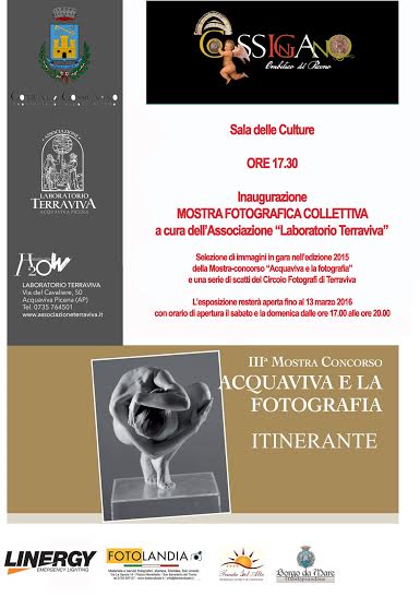 Alle ore 17.30 è prevista l’inaugurazione della Mostra fotografica collettiva a cura dell’Associazione “Laboratorio Terraviva”. Sarà esposta una selezione di immagini in gara nell’edizione 2015 della Mostra-concorso “Acquaviva e la fotografia” ed una serie di scatti del Circolo Fotografi di Terraviva. L’esposizione resterà aperta fino al 13 marzo p.v. con orario di apertura il sabato e la domenica dalle ore 17.00 alle ore 20.00.
