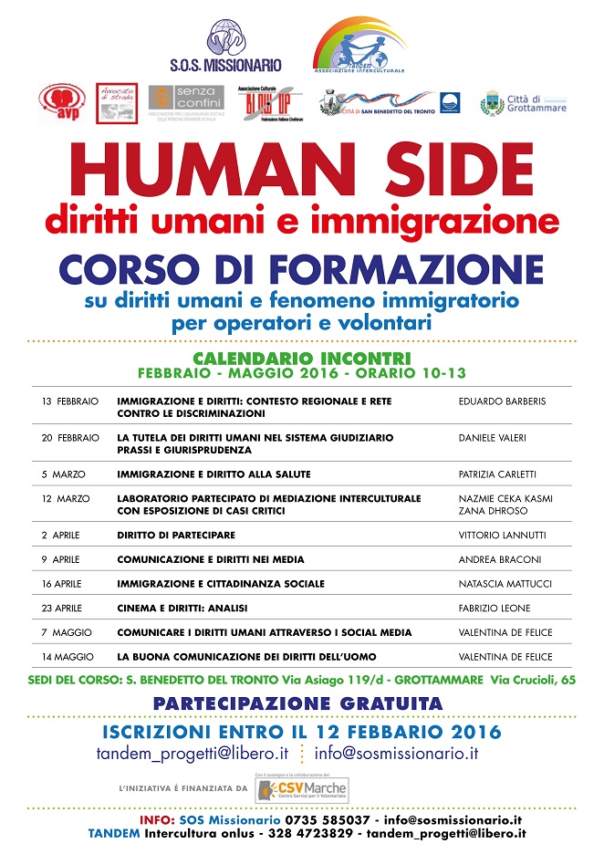 Il corso vede la presenza di docenti qualificati. Il primo incontro è per sabato 13 febbraio con la presenza di E. Barberis dell’Università di Urbino che illustrerà il contesto regionale e la rete contro le discriminazioni. Il 20 febbraio l’avv. Daniele Valeri dell’ass. Avvocato di Strada, presenta il contesto legislativo antidiscriminatorio italiano ed europeo mentre, il 5 marzo, Patrizia Carletti dell’ass. Senza Confini, entrerà nello specifico della difesa del Diritto alla salute. Il 12 marzo è previsto un Laboratorio di Mediazione Interculturale come strumento di contrasto alla discriminazione con Nazmie Ceka Kasmi e Zana Dhroso. I 4 incontri di aprile vedranno la presenza di Vittorio Lannutti – Ricercatore – sul Diritto di Partecipare; del giornalista pubblicista Andrea Braconi sul ruolo svolto dai media nella comunicazione dei diritti; di Natascia Mattucci dell’Università di Macerata sul peso che hanno le comunità locali nel ridefinire la cittadinanza in termini sociali mentre Fabrizio Leone dell’ass. Blow Up, guiderà in un analisi sul tema dei diritti nella cinematografia. Il corso termina a maggio con 2 incontri, guidati da Valentina De Felice, per approfondire l’uso dei Social Media nella comunicazione dei Diritti Umani.