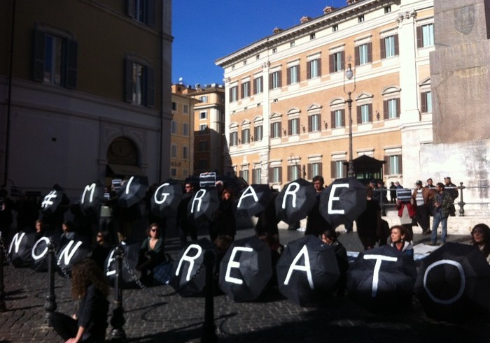Si è tenuto ieri davanti a Palazzo Chigi un flash mob a cui hanno partecipato 18 associazioni che a vario titolo si occupano di immigrazione (tra cui Medici per diritti umani, Amnesty international, Asgi, Cir) per riaccendere l’attenzione dell’opinione pubblica e del dibattito politico sul reato di immigrazione irregolare che il Governo ritarda ad abrogare, pur avendo da quasi due anni ricevuto mandato dal Parlamento. Con il messaggio “Migrare non è reato” veicolato attraverso ombrelli e il lancio dell’hashtag #migrarenonèreato, i volontari e gli attivisti di varie associazioni e movimenti, hanno chiesto al governo di abrogare “una legge ingiusta, inutile, dannosa e clandestina”. “Ingiusta – spiegano i promotori -, perché punisce una persona unicamente in base al suo status. Inutile, perché non ha alcun effetto deterrente sull’immigrazione irregolare e non ferma le stragi in mare, come confermano i dati. Dannosa, perché produce ghettizzazione, razzismo e disagio sociale. Clandestina, perché il governo avrebbe dovuto provvedere alla sua abrogazione ma ritarda, adducendo motivazioni di inopportunità temporale, psicologica e di percezione di insicurezza”. Già nell’aprile 2015, Amnesty International, A Buon Diritto, Asgi e Medici per i diritti umani avevano scritto una lettera aperta al presidente del Consiglio chiedendo al Governo di esercitare la delega del Parlamento per procedere alla cancellazione del reato. Anche il procuratore capo della Direzione nazionale antimafia e antiterrorismo Franco Roberti, sostiene che la legge andrebbe abrogata non solo per la sua inutilità ma anche perché dannosa. Oggi le associazioni rinnovano la richiesta al governo italiano di “dare seguito quanto prima all’incarico ricevuto, procedendo alla cancellazione definitiva e completa del reato di immigrazione irregolare” perché credono “che chi fugge da guerre, torture e miseria in cerca di una possibilità di esistenza debba essere tutelato e non punito, meriti protezione e non ghetti”.