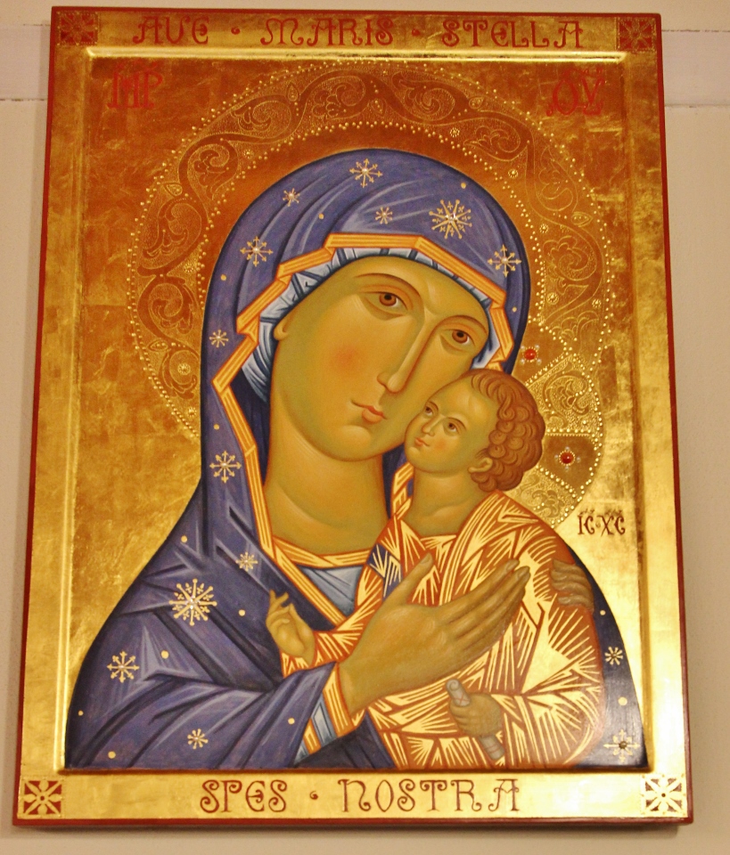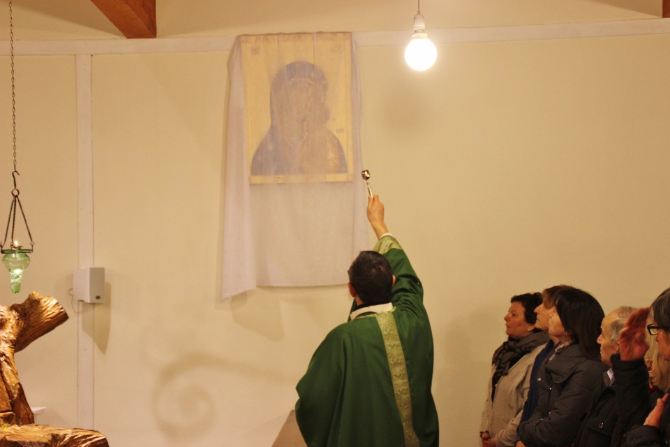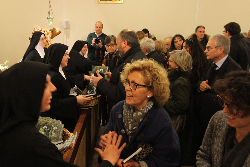 Egli continua ad amarci sempre, anche quando noi non ce la facciamo, perché ci sono dei giorni in cui guardiamo in basso, dei giorni in cui ci alziamo con la luna storta. Il Signore continua ad amarci. Una comunità consacrata si regge sulla Parola, si nutre della comunione fraterna che scaturisce dall’Eucarestia ed è capace di parlare una buona notizia. Molte cose, confidenze o s.o.s., che le monache ricevono non potranno risolverle, perché molti problemi non sono nostri e non sono di facile soluzione; noi non abbiamo ricette per tutti e d’altra parte Dio non ci ha chiesto di salvare il mondo, perché quello spetta a lui. Ma se un fratello viene al monastero o in parrocchia chiede semplicemente di essere ascoltato, che qualcuno condivida con lui la sua fatica e magari dica semplicemente “io ti voglio bene”, e non è una cosa di poco conto. Capite che la ricchezza di una presenza monastica in una città non si misura quantitativamente, non fa parte del Pil, ma si misura in Cristo che è in vista del Regno di Dio. A me piace moltissimo un libro, il “Dialogo delle carmelitane” di Georges Bernanos. Siamo ai tempi della Rivoluzione francese e una nobile chiede di entrare in monastero, ma la badessa, una donna molto forte, le risponde: “Noi non siamo un istituto di moltiplicazioni, né un conservatorio di virtù; noi siamo delle donne votate all’orazione. Se il mondo non crede nella potenza dell’orazione, non potrà considerarci altro che impostori o parassiti; ma per chi crede nella potenza dell’orazione, noi siamo una casa di orazione”. Questa è una casa di orazione: il vostro cammino è scandito dalla campanellina che scandisce le lodi, l’ora media, il vespro, la compieta, e che accompagna l’uomo contemporaneo che spesse volte non ha un briciolo di speranza. Noi oggi venereremo un’icona, preparata da padre Paolo, e l’icona di questo monastero, la Madre della Speranza, madre dei poveri. Celebro questa messa per gli amici del monastero: ci sono quelli vivi e quelli che sono in Paradiso; tutti quelli che le sorelle si sono trovati sul loro cammino in questi venti anni.” Dopo le parole pronunciate da padre Giancarlo è stata scoperta l’icona realizzata da Paolo Bocci. “Ti offriamo, o Signore, questa icona della Madre di Dio, Stella Maris, per celebrare l’anniversario della fondazione del nostro monastero – ha affermato la superiora, suor Riccarda -. Ad essa, segno di speranza per il popolo di Dio, vogliamo affidare ancora il nostro cammino di vita comunitaria. Come madre, essa divenga nel nostro monastero segno di speranza per tutti coloro che emarginati dalla società cercano un punto luminoso per incontrare l’amore di Dio e doni calore e vita ai giovani che hanno perduto il senso della vita. La dolcezza della Madre sappia lenire le sofferenze di ogni cuore e infonda la speranza che viene da Gesù, vincitore del male e della morte.