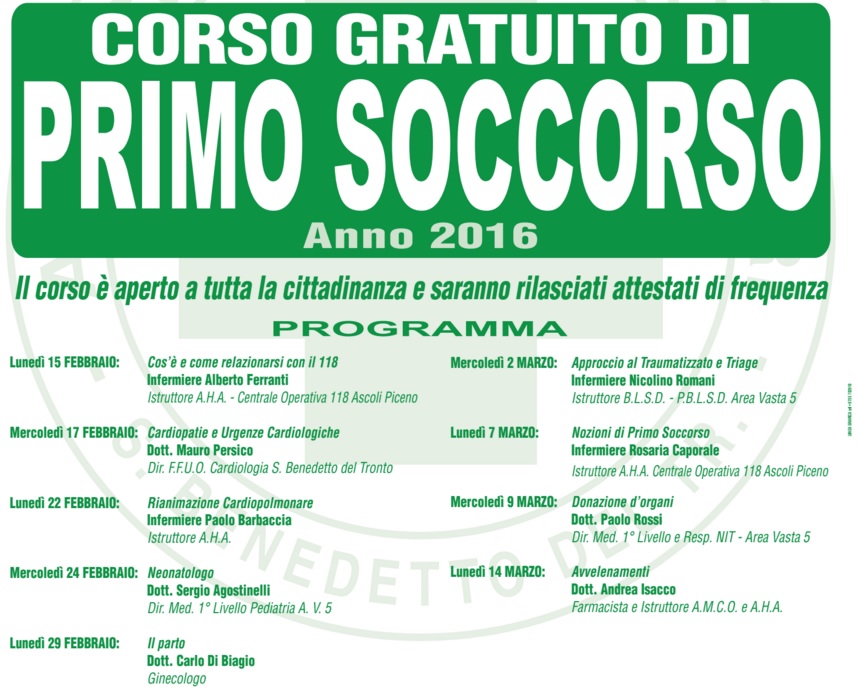 Roberto Lucidi dichiara: “Il corso è aperto a tutta la popolazione ed è finalizzato alla conoscenza delle problematiche e delle manovre di primo soccorso, sia per cultura personale di chi è interessato, sia per chi, avendo tempo e disponibilità, voglia poi diventare volontario della Croce Verde di San Benedetto del Tronto o di Cupra Marittima. Alla fine del corso verrà rilasciato un attestato di frequenza”.