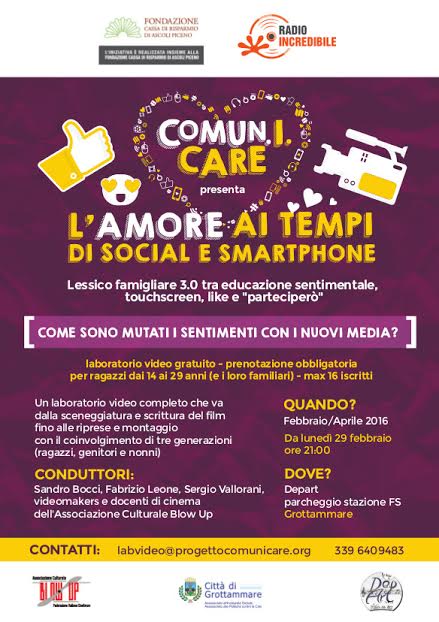 Da lunedì 29 febbraio 2016, in collaborazione con l’ Associazione Culturale Blow Up, si terrà un laboratorio video dal titolo “L’amore ai tempi di social e smartphone” – Lessico famigliare 3.0 tra educazione sentimentale, touchscreen, like e “parteciperò” presso il DepArt (parcheggio della stazione FS) di Grottammare, ogni lunedì dalle ore 21: un laboratorio video completo che va dalla sceneggiatura e scrittura del film fino alle riprese e montaggio con il coinvolgimento di tre generazioni (ragazzi, genitori e nonni). Il laboratorio e il video che ne nascerà si interrogano sui mutamenti dei sentimenti in rapporto con i nuovi media.