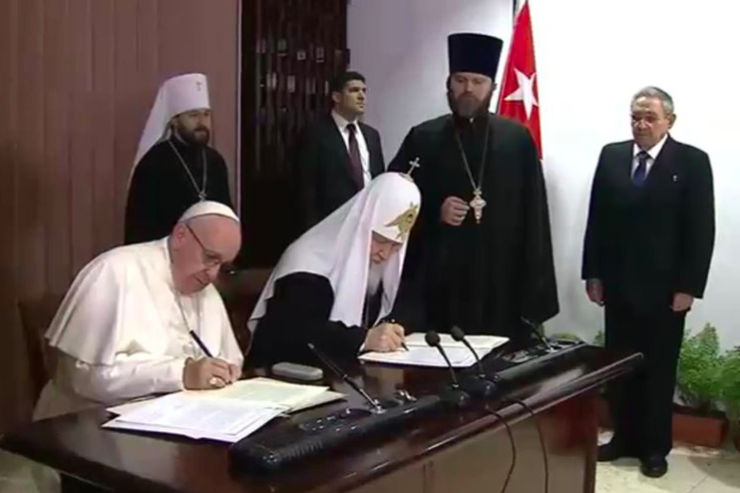 1. Per volontà di Dio Padre dal quale viene ogni dono, nel nome del Signore nostro Gesù Cristo, e con l’aiuto dello Spirito Santo Consolatore, noi, Papa Francesco e Kirill, Patriarca di Mosca e di tutta la Russia, ci siamo incontrati oggi a L’Avana. Rendiamo grazie a Dio, glorificato nella Trinità, per questo incontro, il primo nella storia. Con gioia ci siamo ritrovati come fratelli nella fede cristiana che si incontrano per «parlare a viva voce» (2 Gv12), da cuore a cuore, e discutere dei rapporti reciproci tra le Chiese, dei problemi essenziali dei nostri fedeli e delle prospettive di sviluppo della civiltà umana.